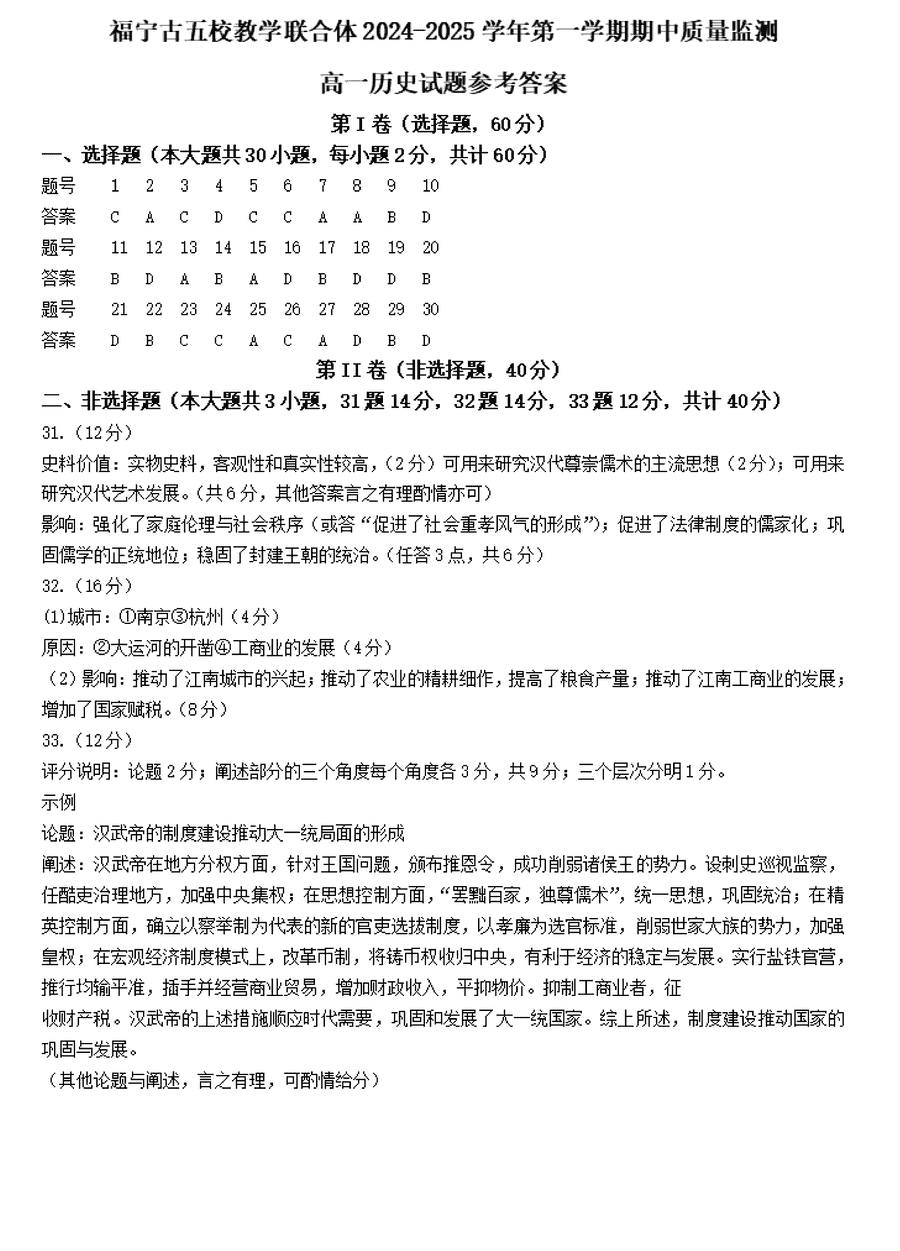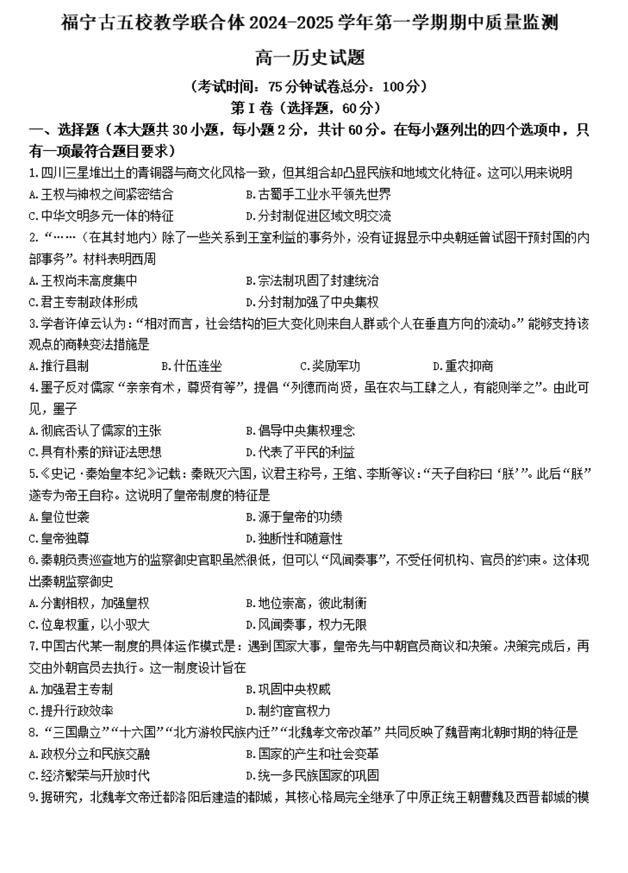 福宁古五校教学联合体2024-2025学年高一上学期期中历史试题及答案