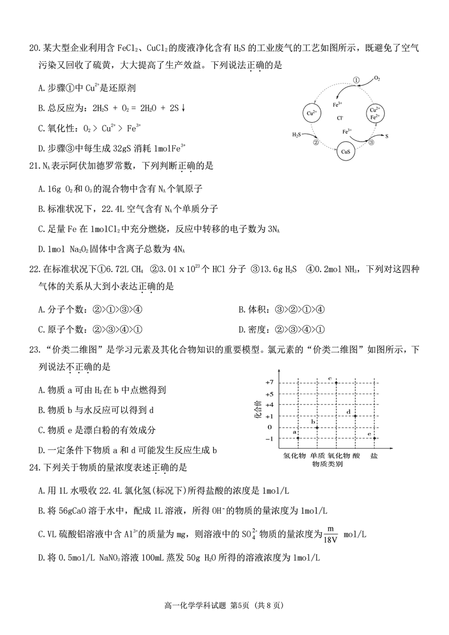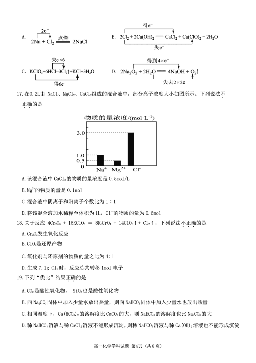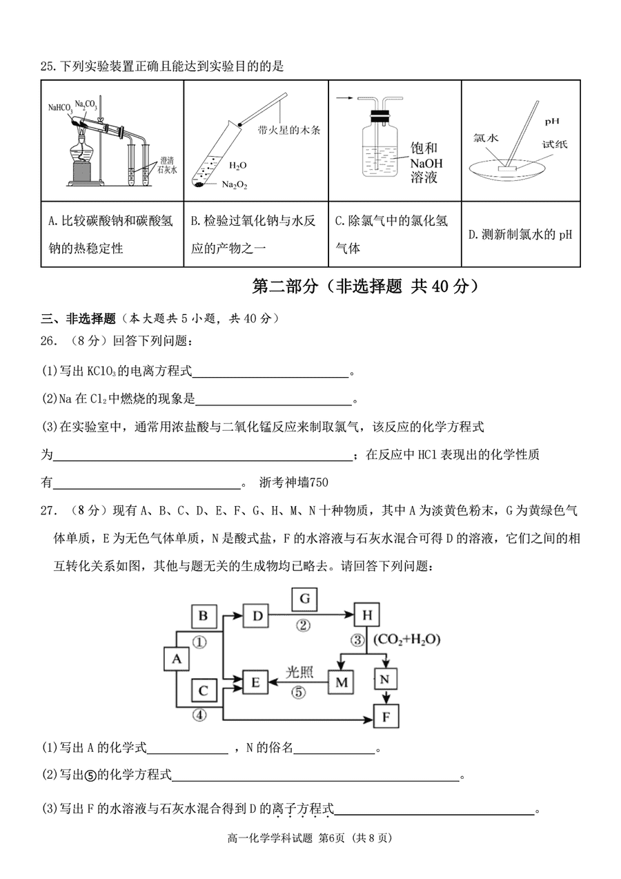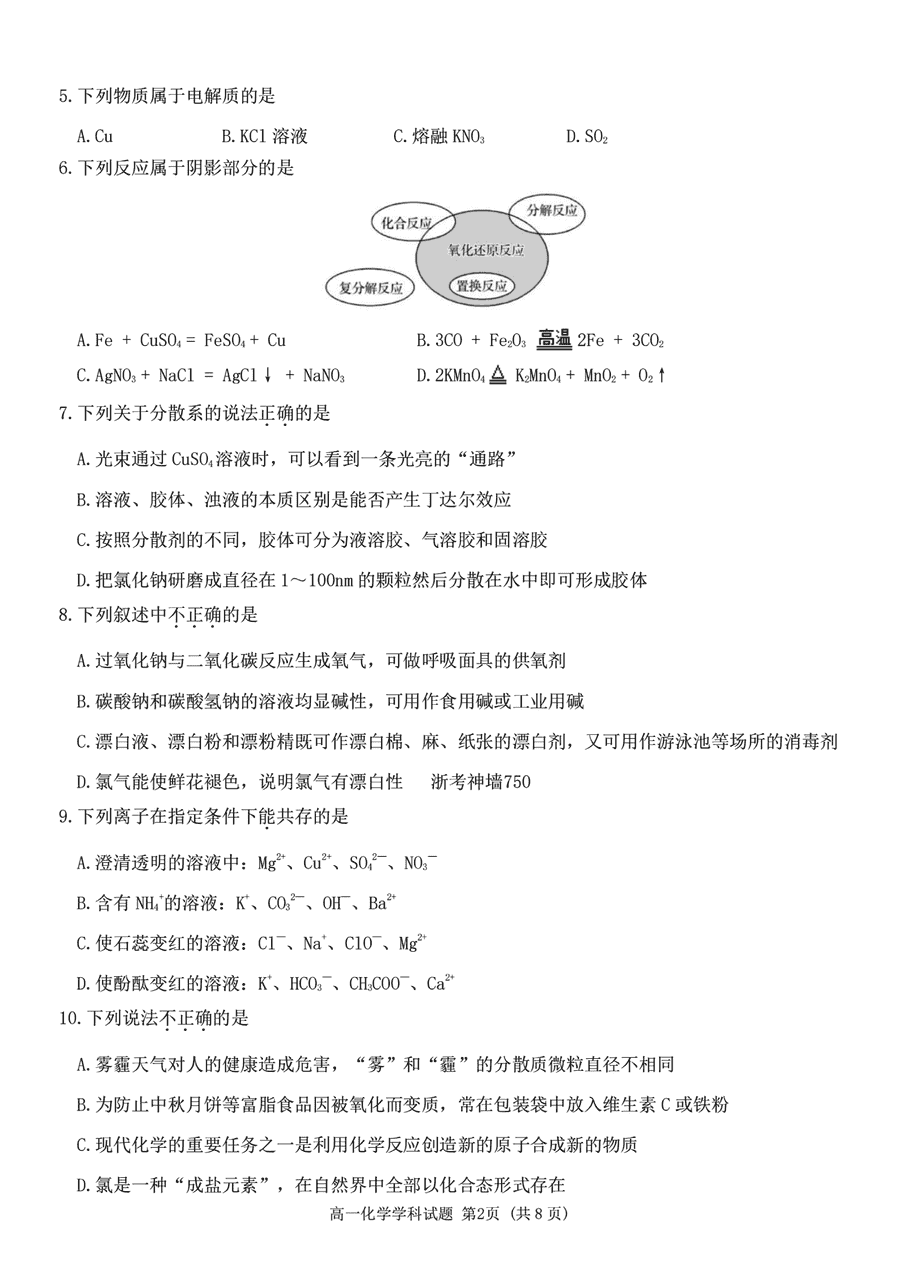 嘉兴八校2024-2025学年高一期中化学试题及答案