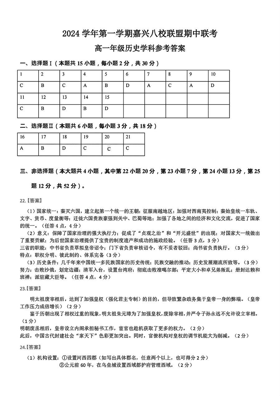 浙江省嘉兴八校2024-2025学年高一期中历史考试已于近日开考,为方便考生考后及时查看考试情况,查漏补缺、弥补不足,本文整理了试题答案解析相关信息!