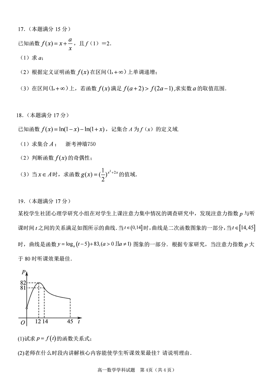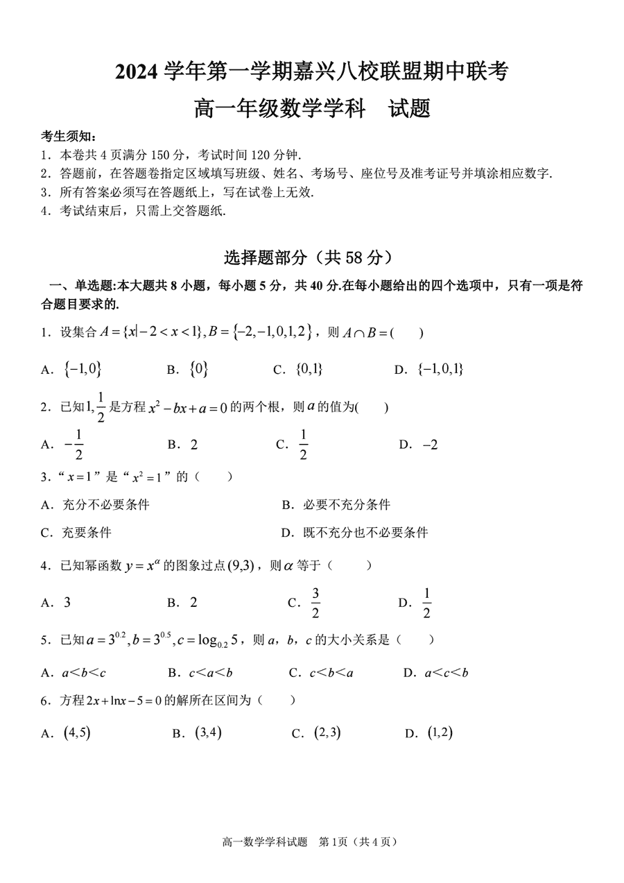嘉兴八校2024-2025学年高一期中数学试题及答案