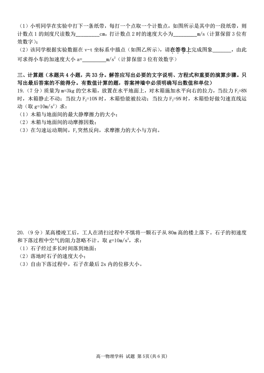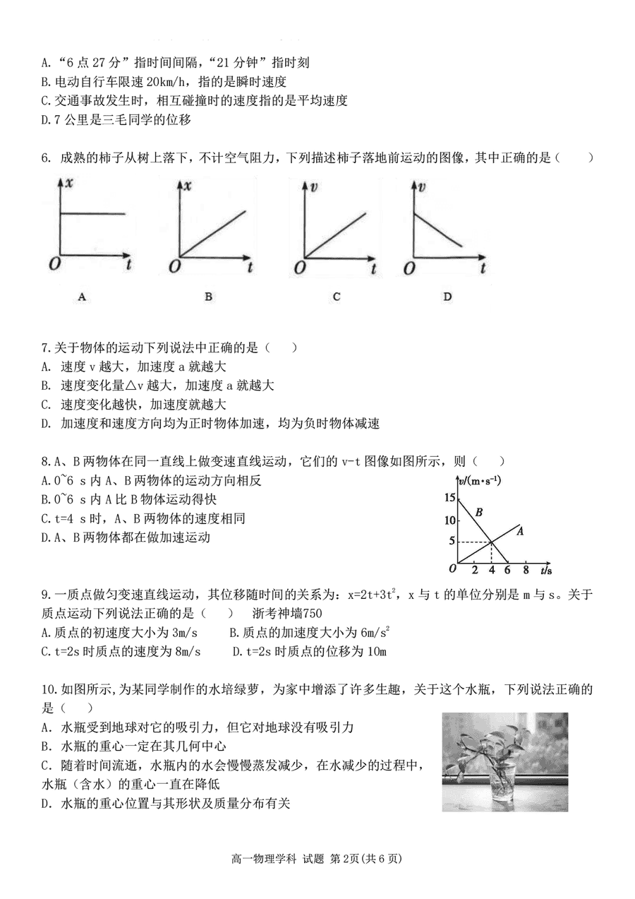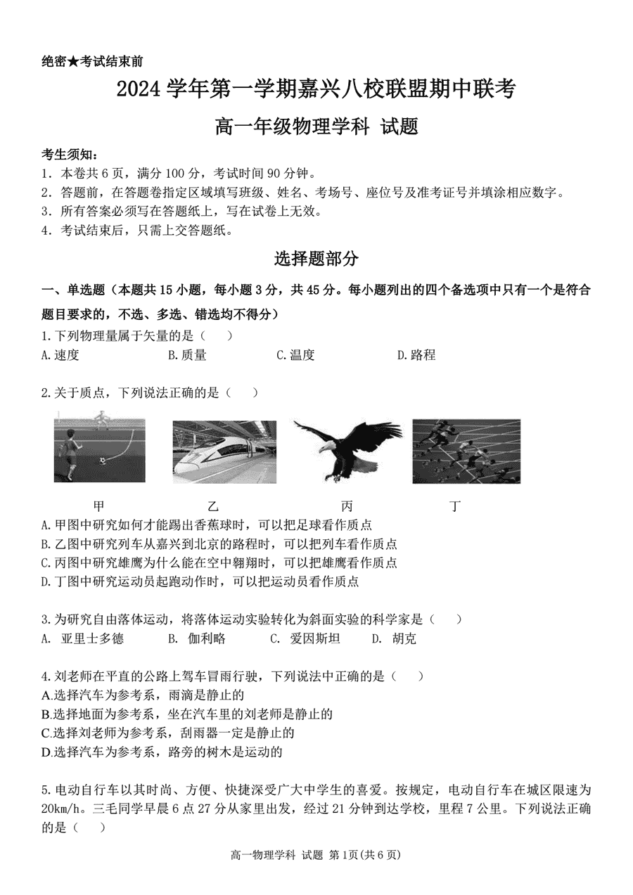 嘉兴八校2024-2025学年高一期中物理试题及答案