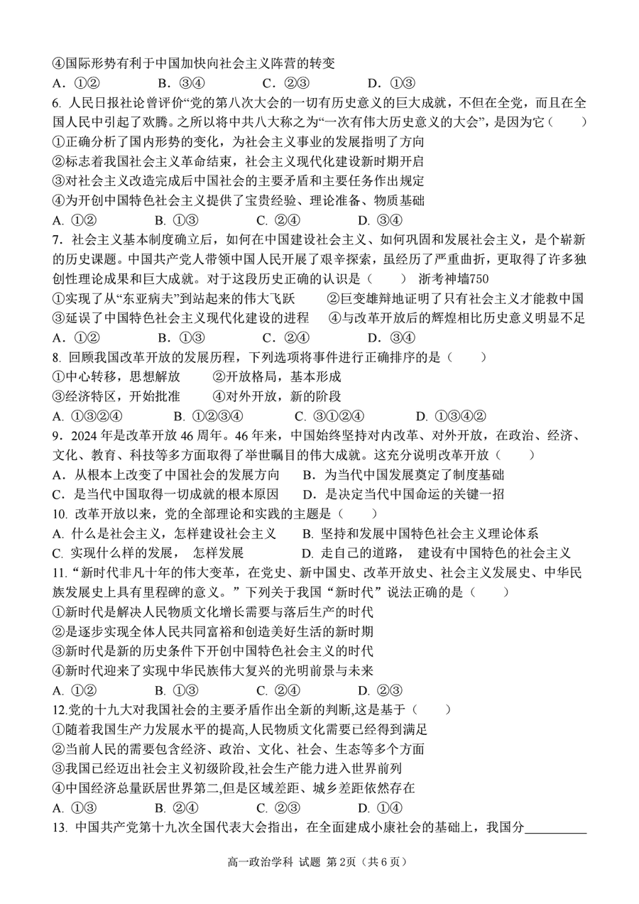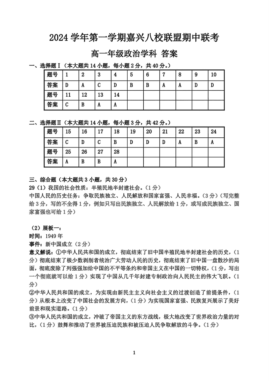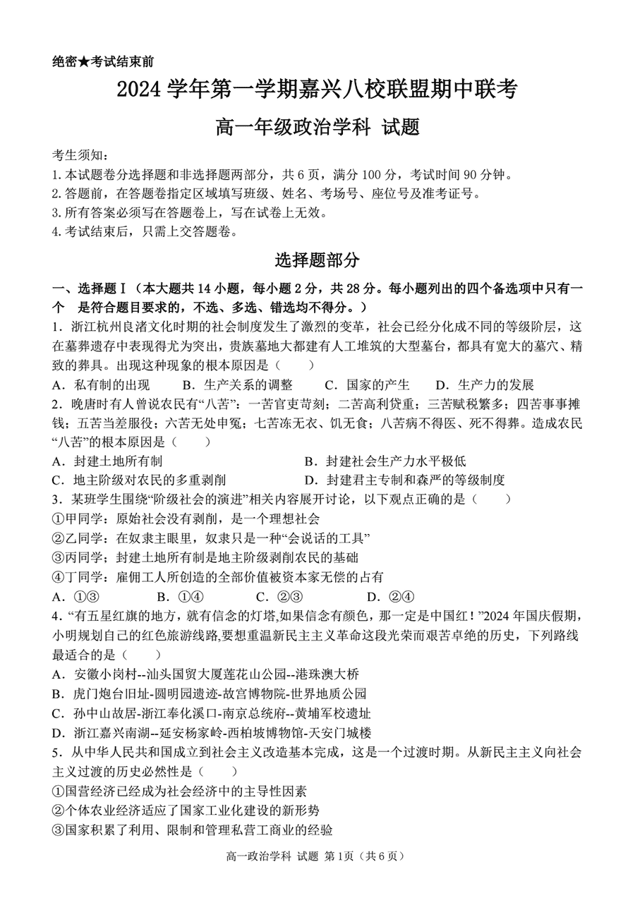 嘉兴八校2024-2025学年高一期中政治试题及答案