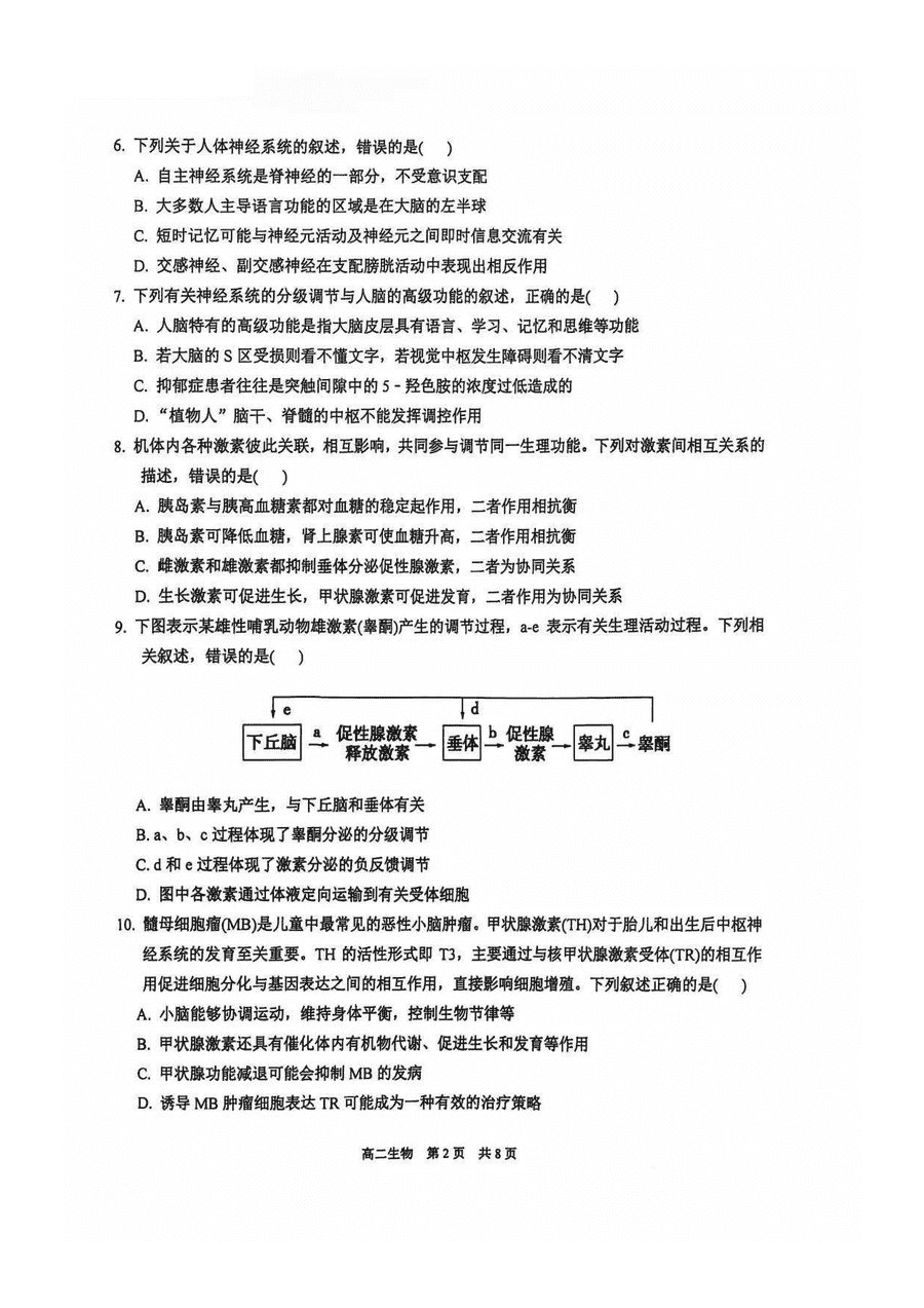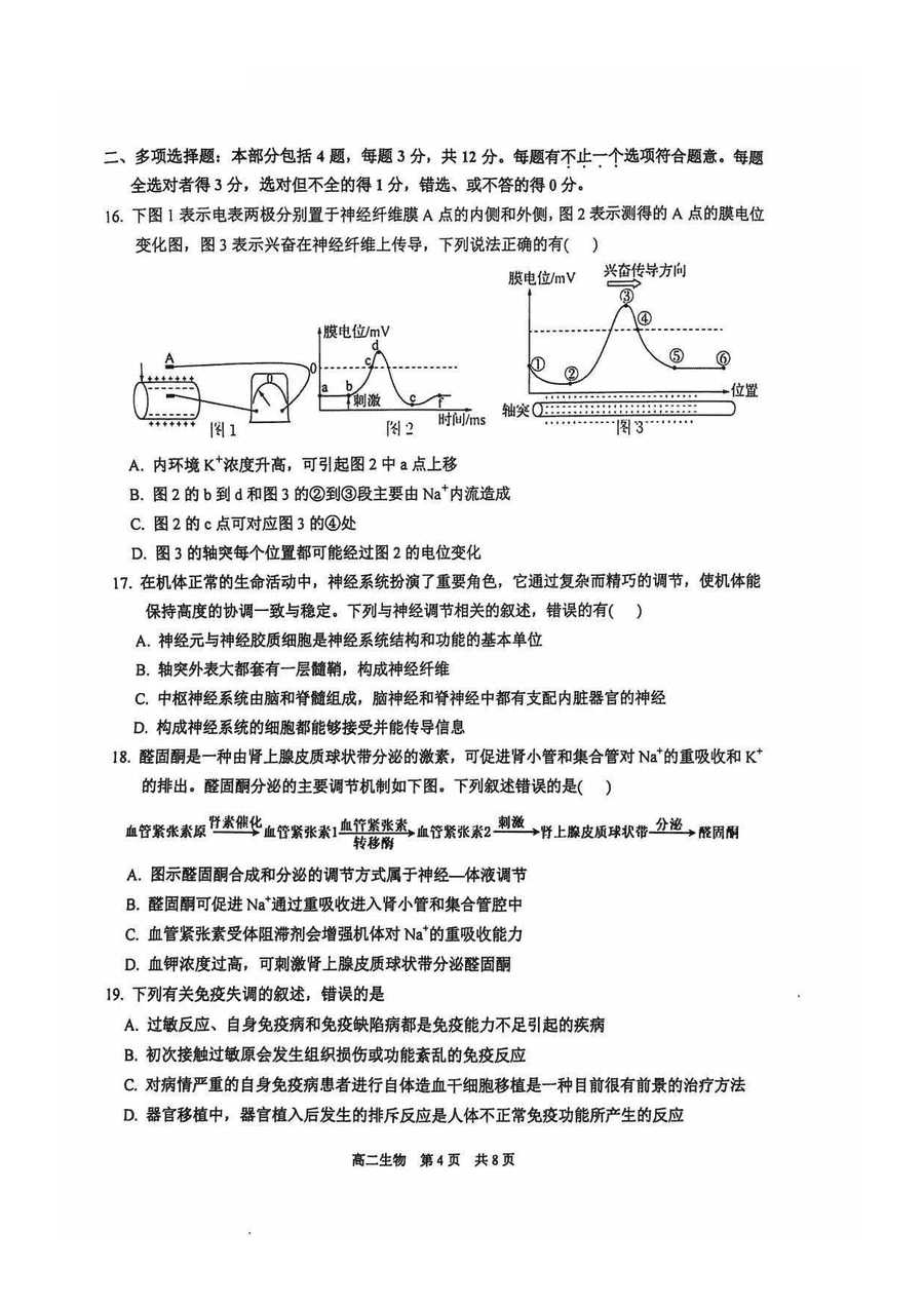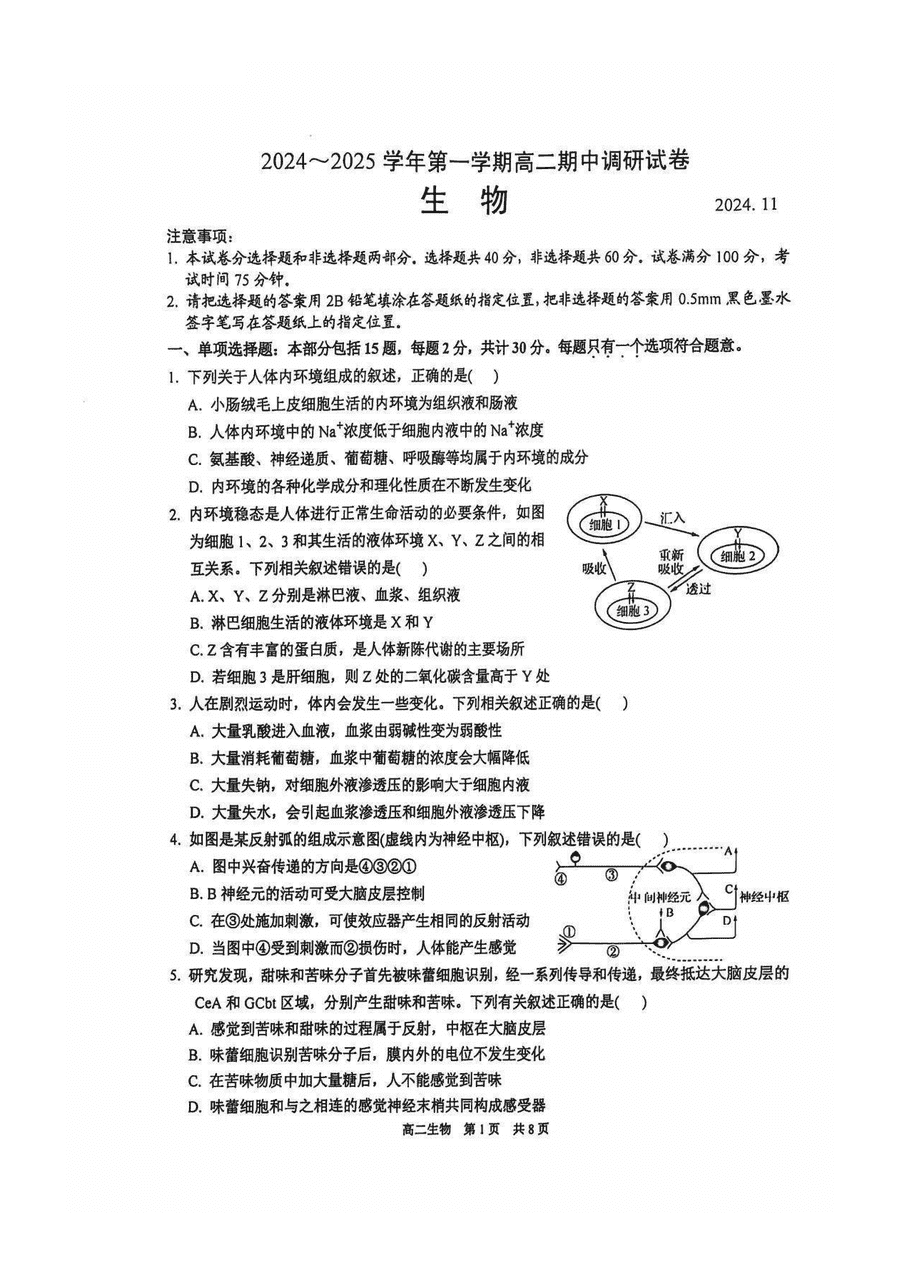江苏苏州2024-2025学年上学期高二期中生物试题及答案