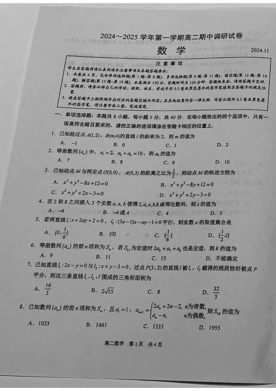 江苏苏州2024-2025学年上学期高二期中数学试题及答案