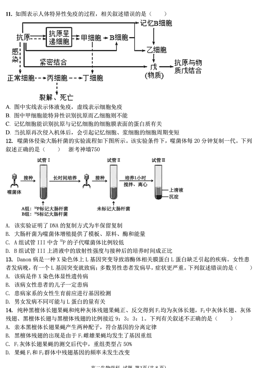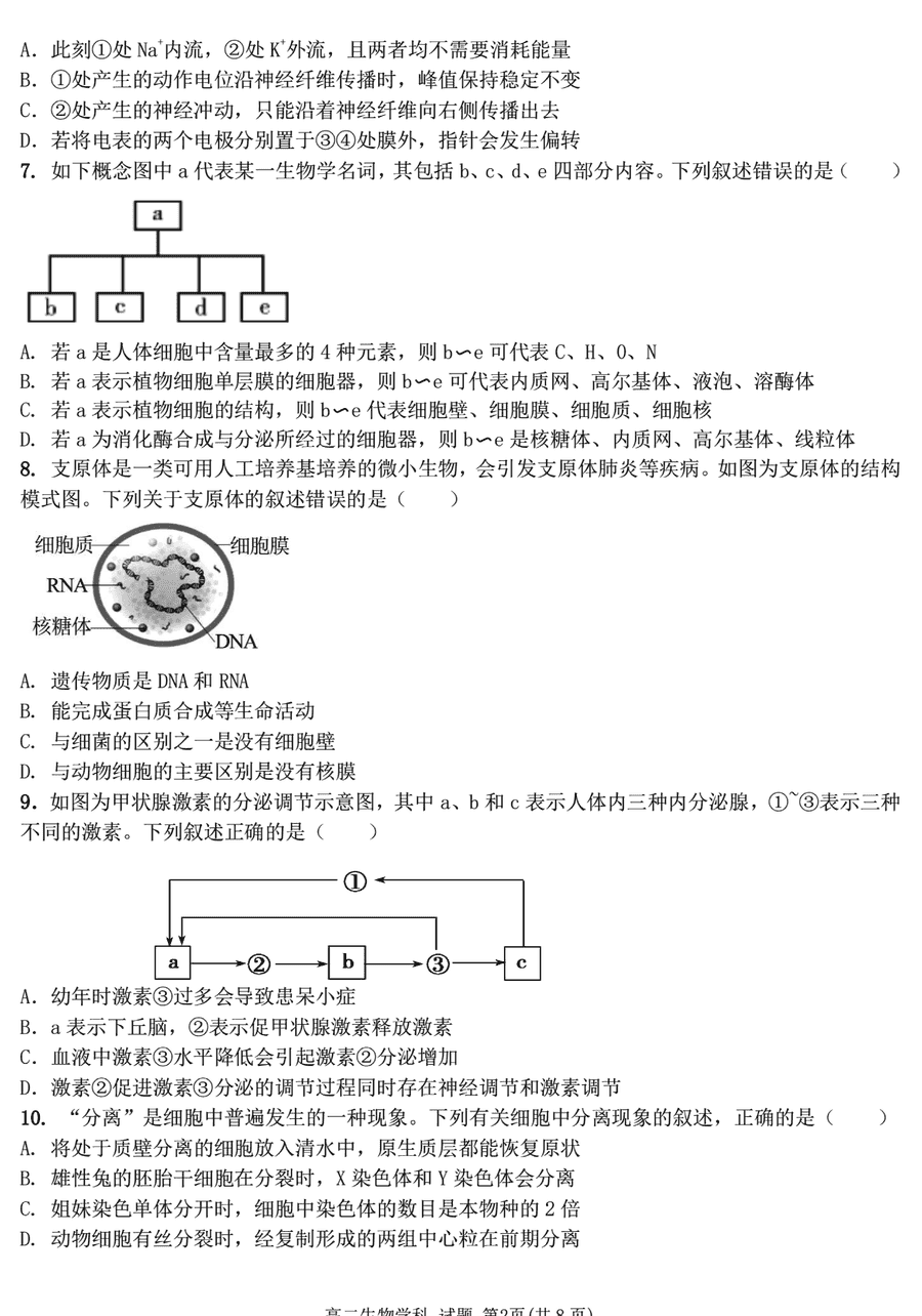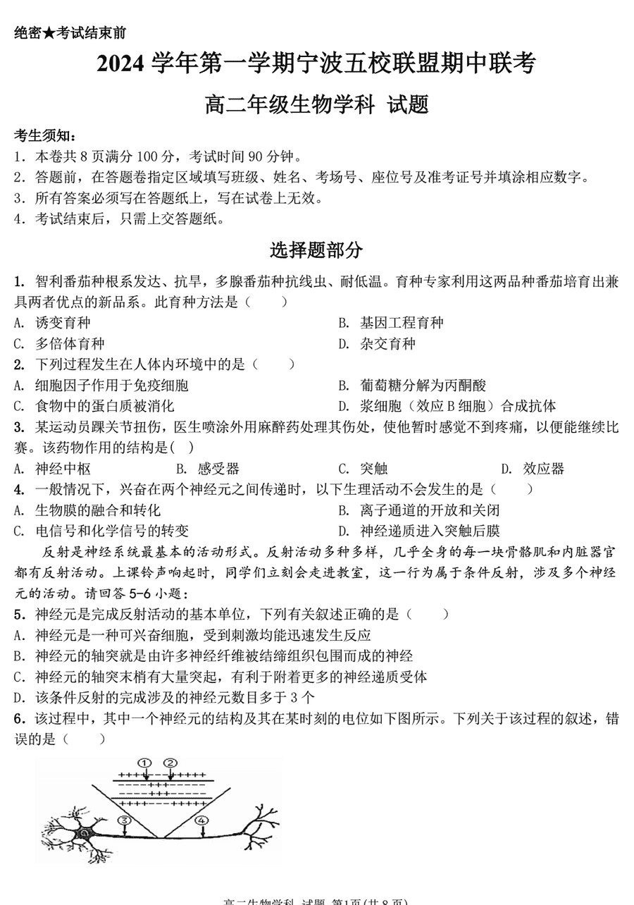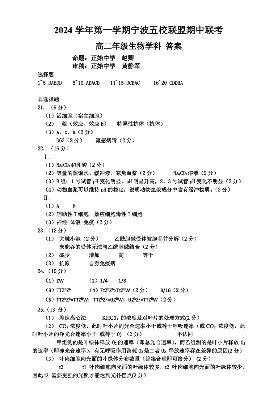 宁波五校联盟2024-2025学年高二期中生物试题及答案