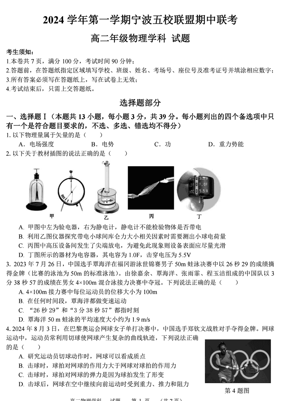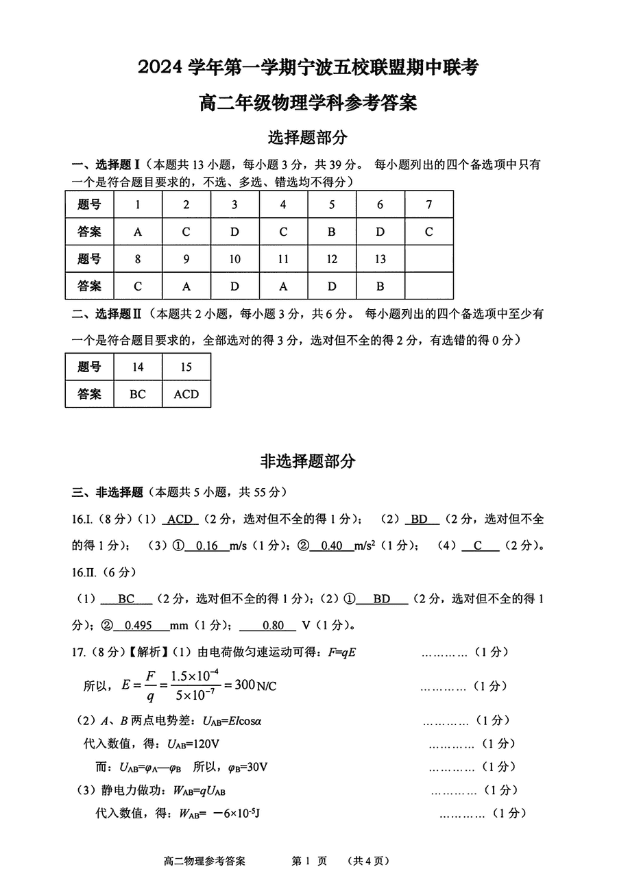 宁波五校联盟2024-2025学年高二期中物理试题及答案