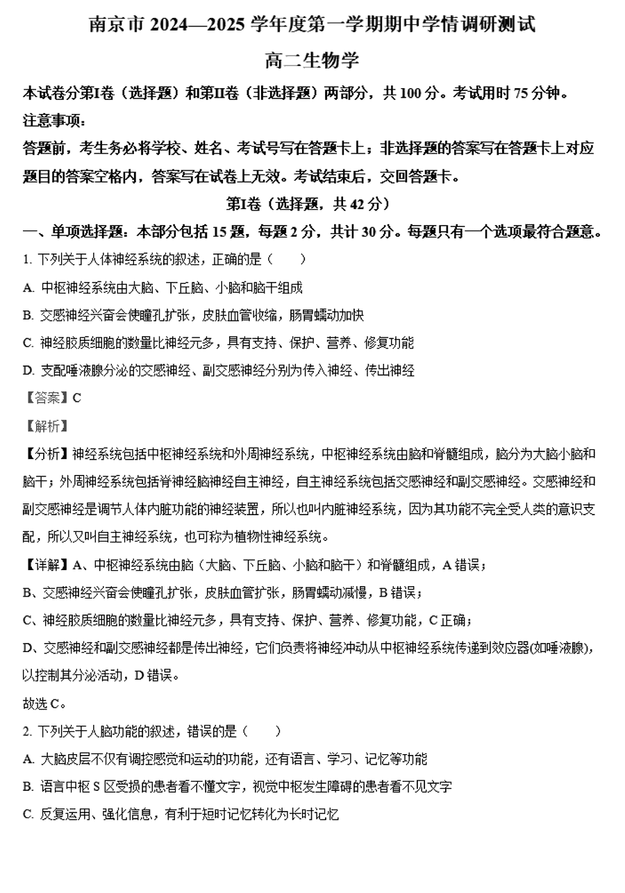 南京市2024-2025学年高二上学期期中生物试题及答案