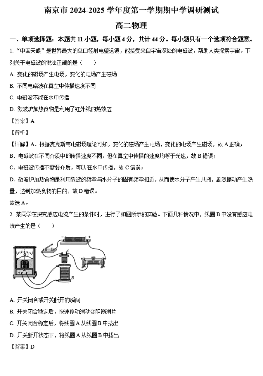 南京市2024-2025学年高二上学期期中物理试题及答案
