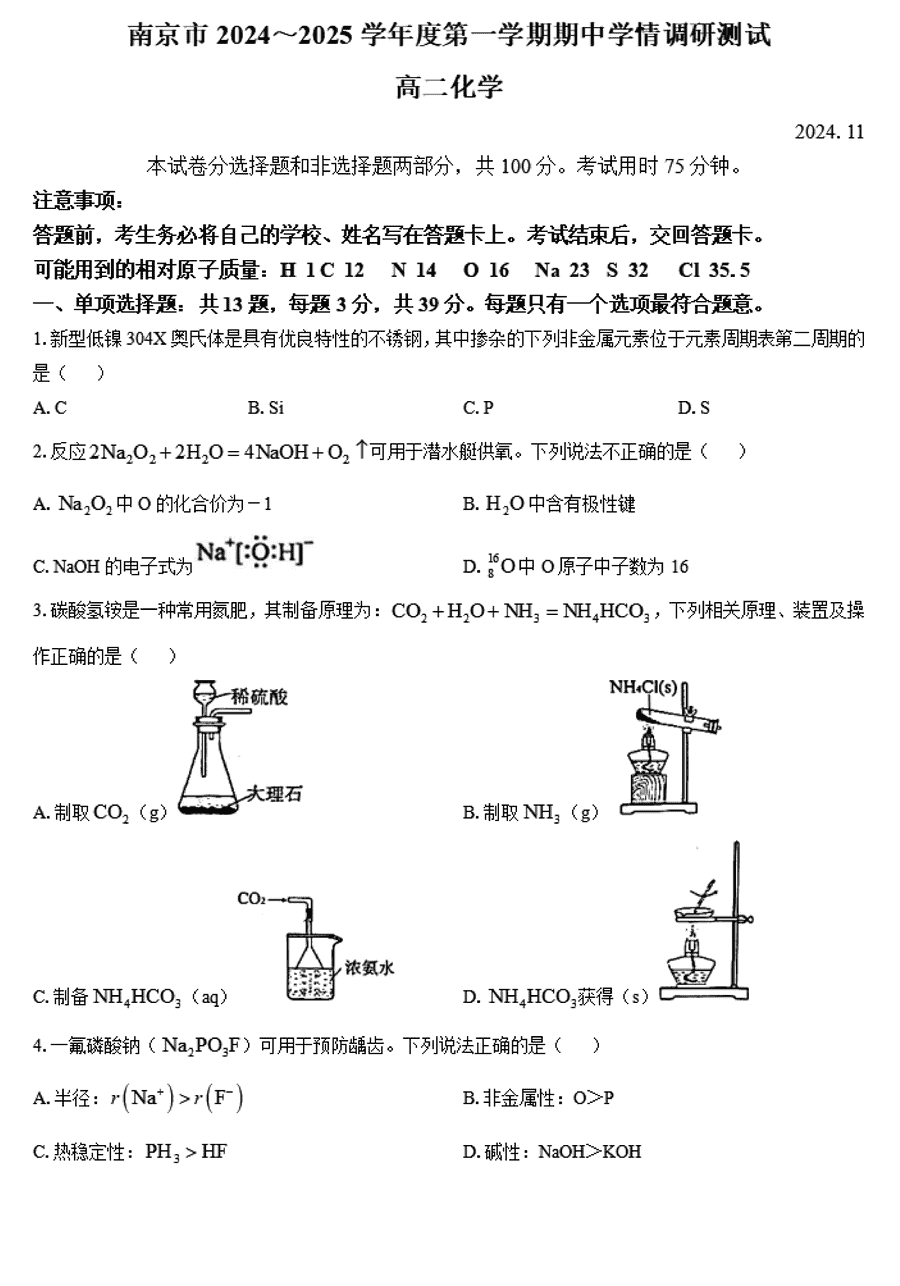南京市2024-2025学年高二上学期期中化学试题及答案