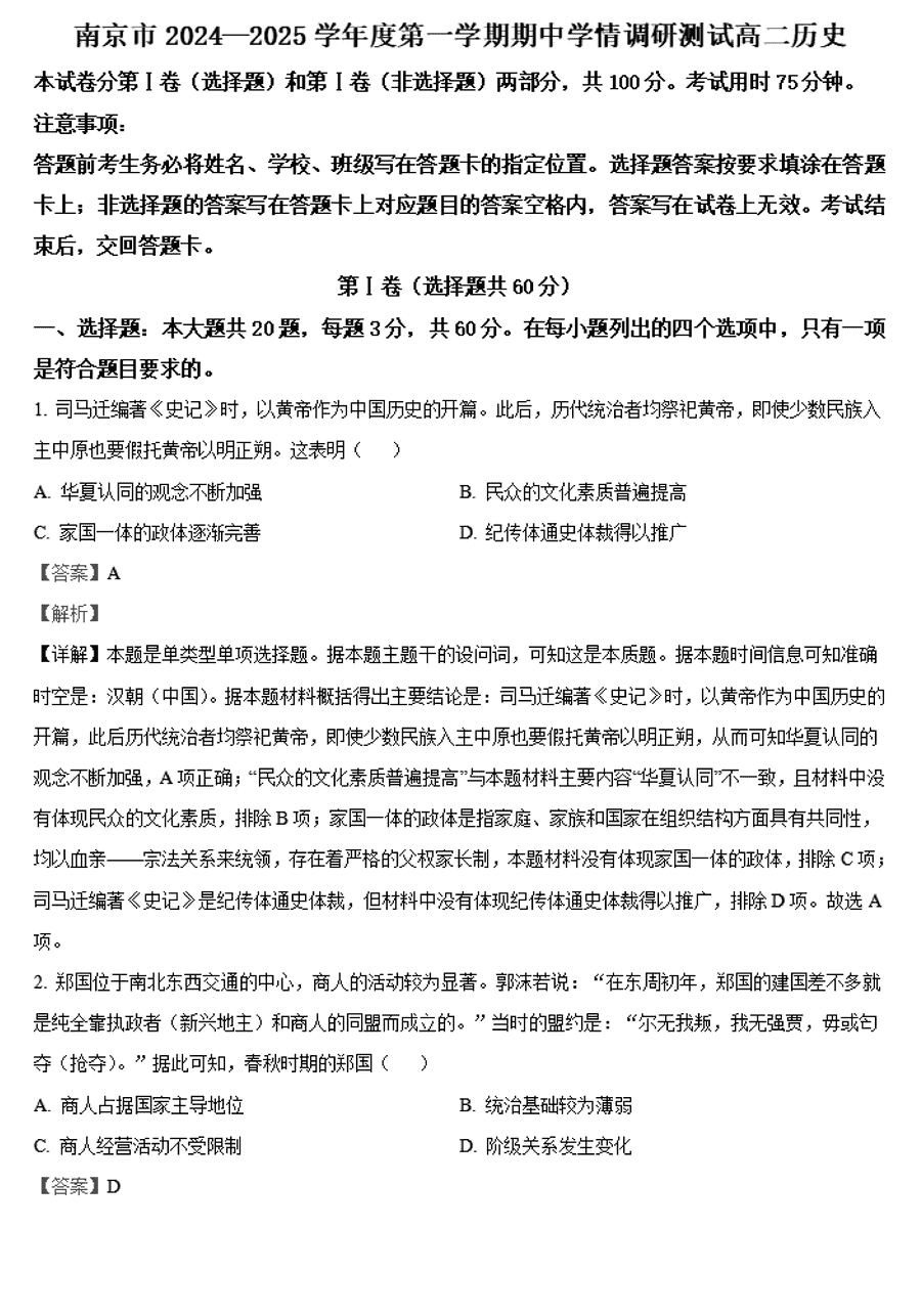 南京市2024-2025学年高二上学期期中历史试题及答案