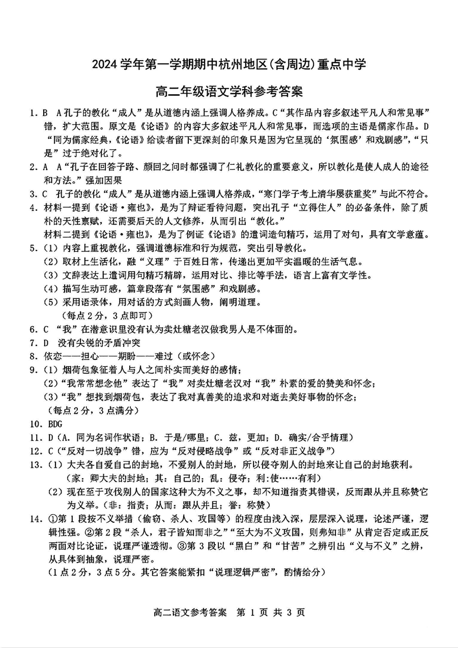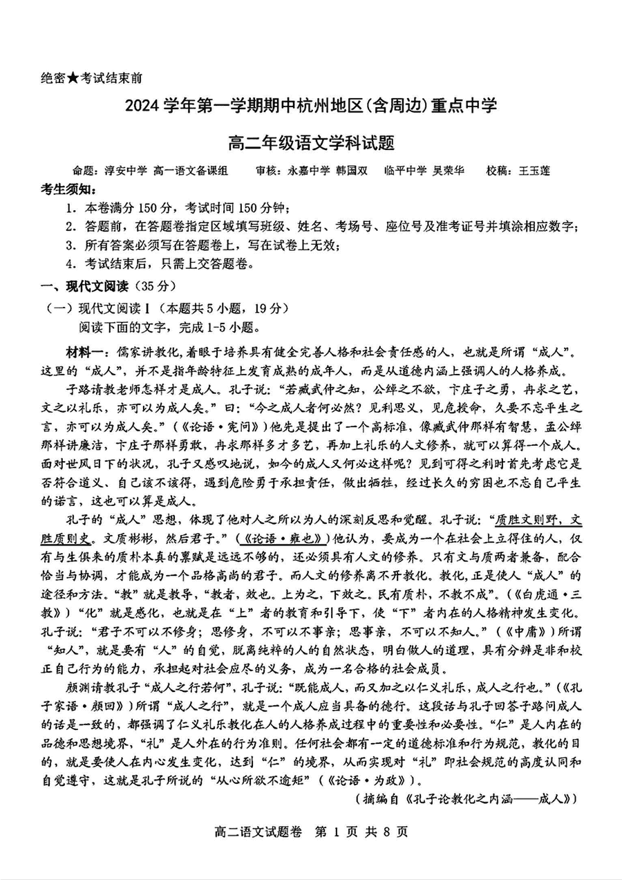 杭州地区(含周边)重点中学2024-2025学年高二上学期11月期中语文考试已于近日开考,为方便考生考后及时查看考试情况,查漏补缺、弥补不足,本文整理了试题答案解析相关信息!