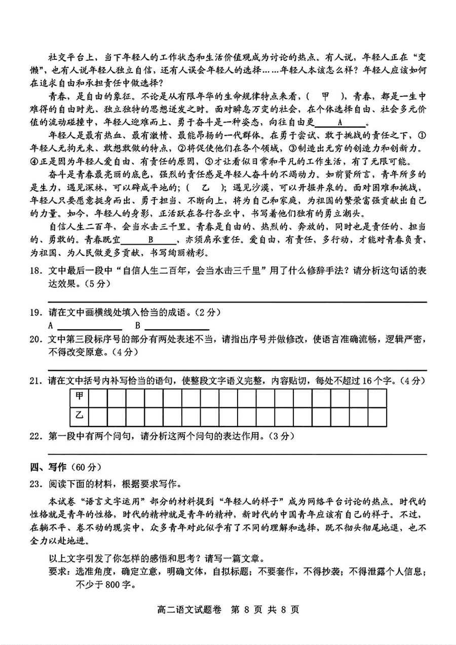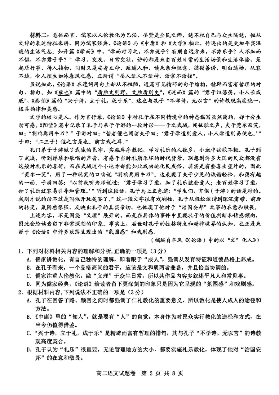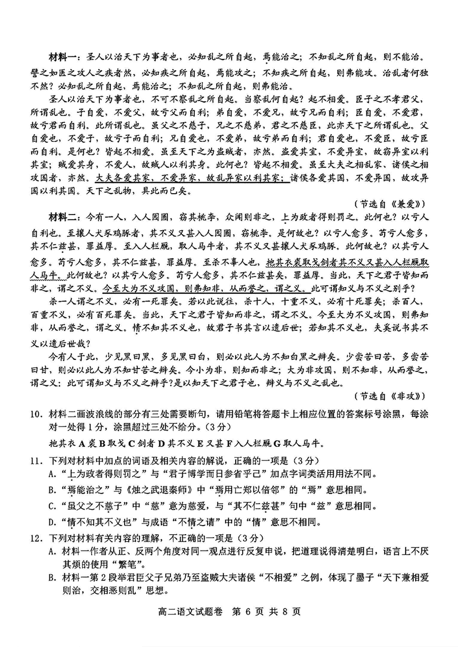 杭州重点中学2024-2025学年高二上学期11月期中语文试题及答案
