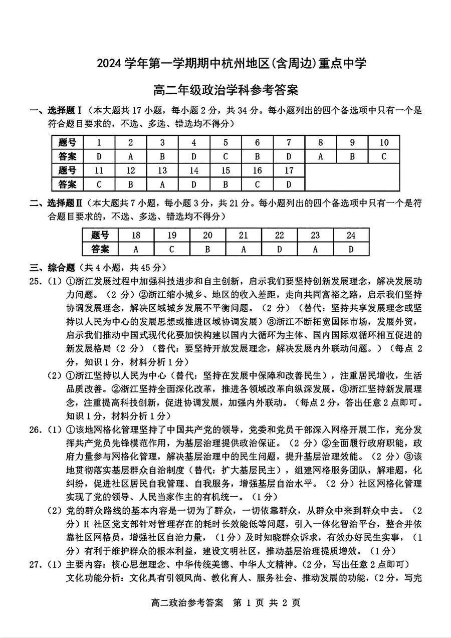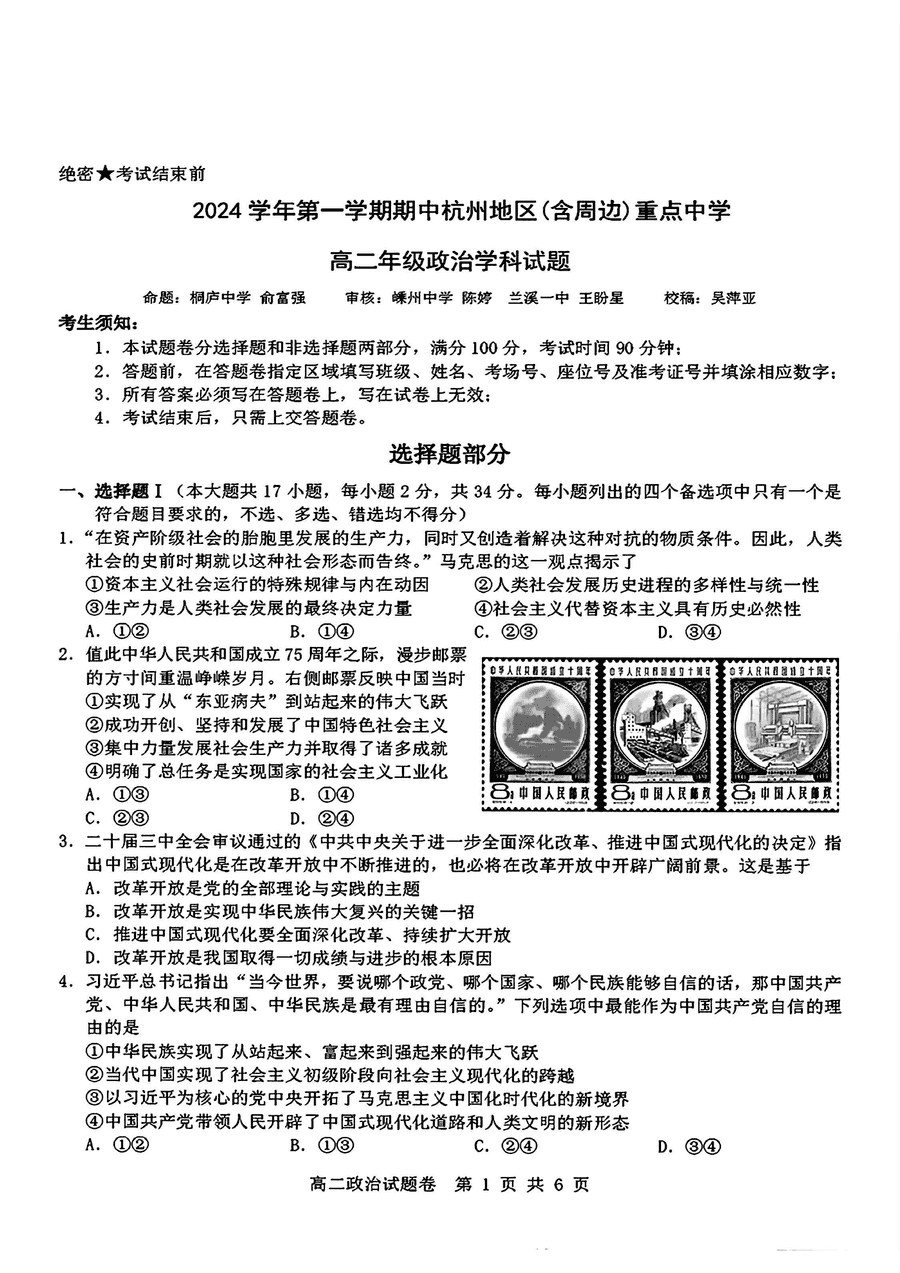 杭州重点中学2024-2025学年高二上学期11月期中历史试题及答案