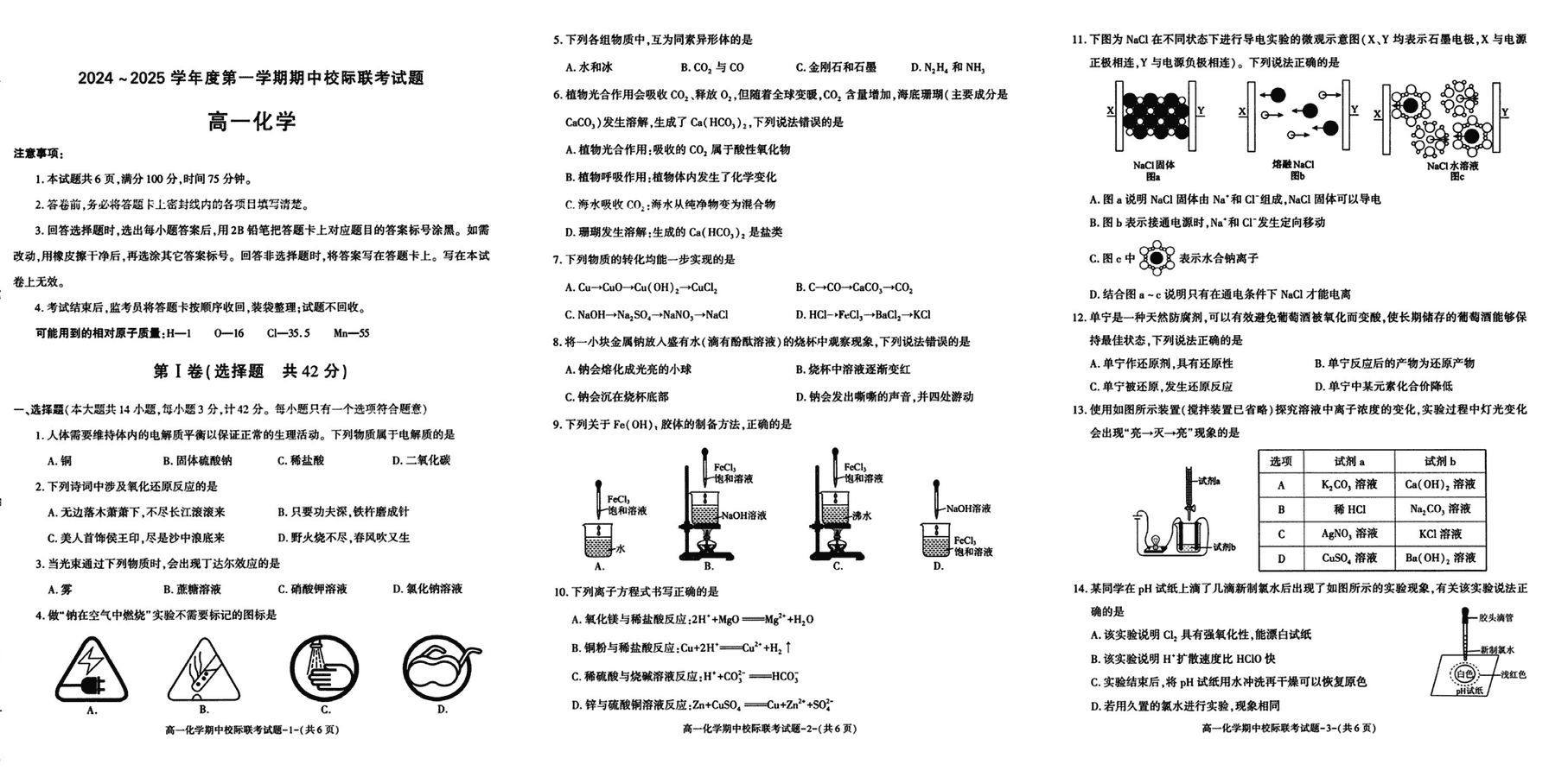 汉中期中联考2024-2025学年高一11月期中化学试题及答案