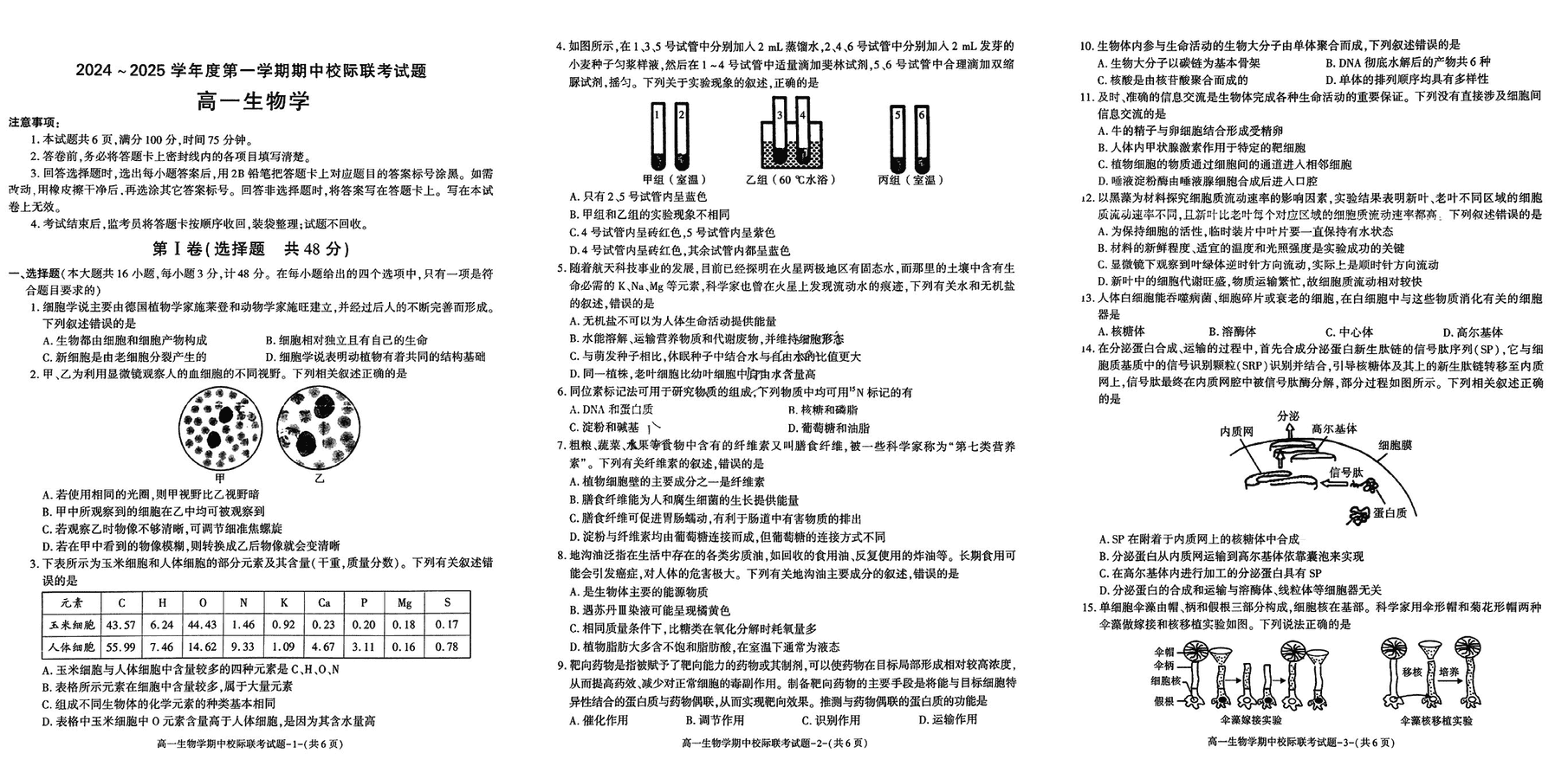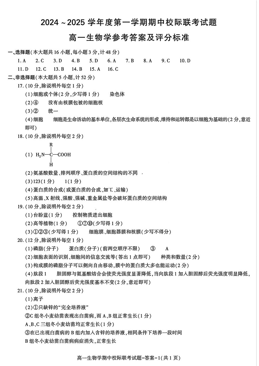 汉中期中联考2024-2025学年高一11月期中生物试题及答案
