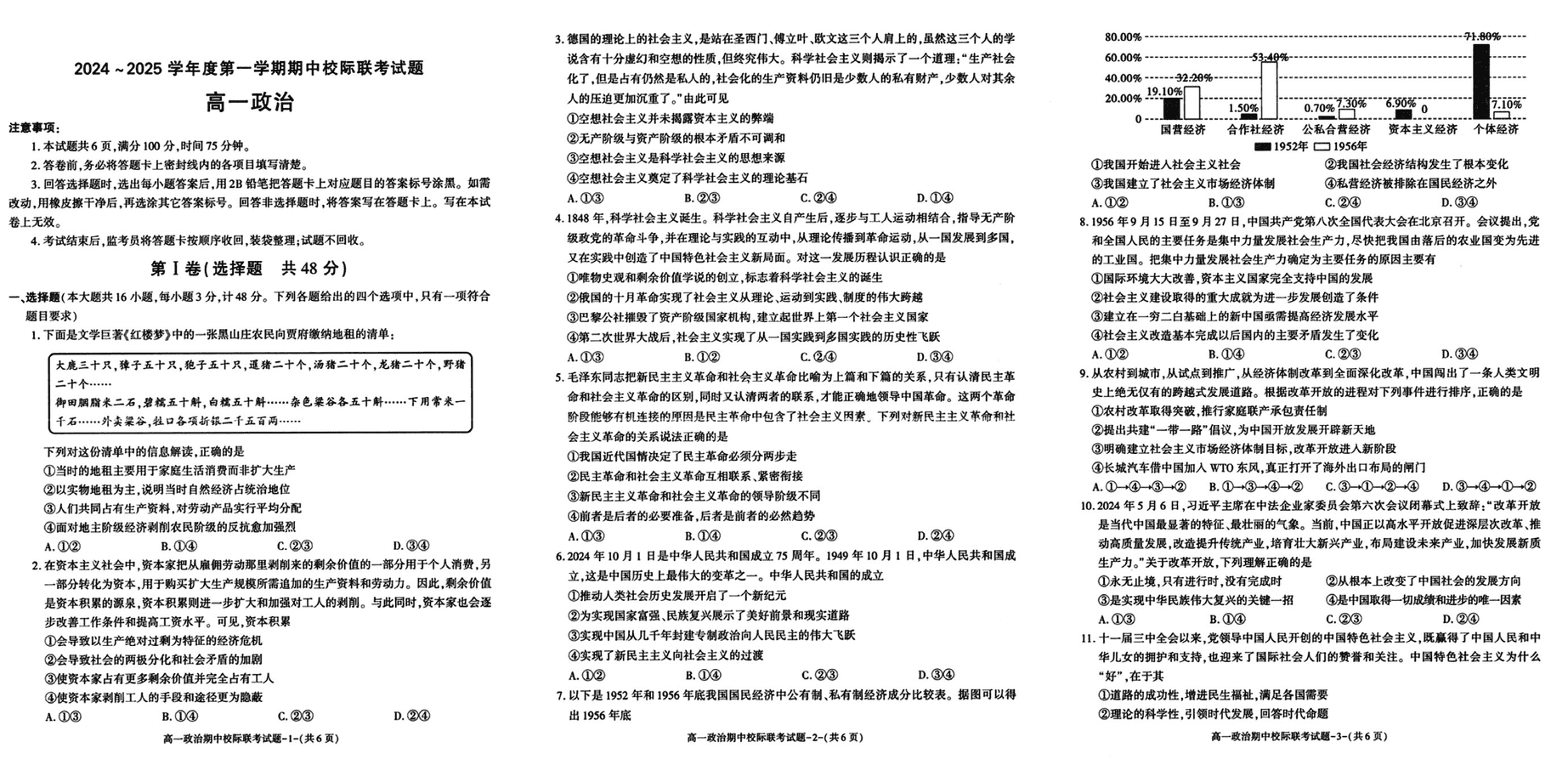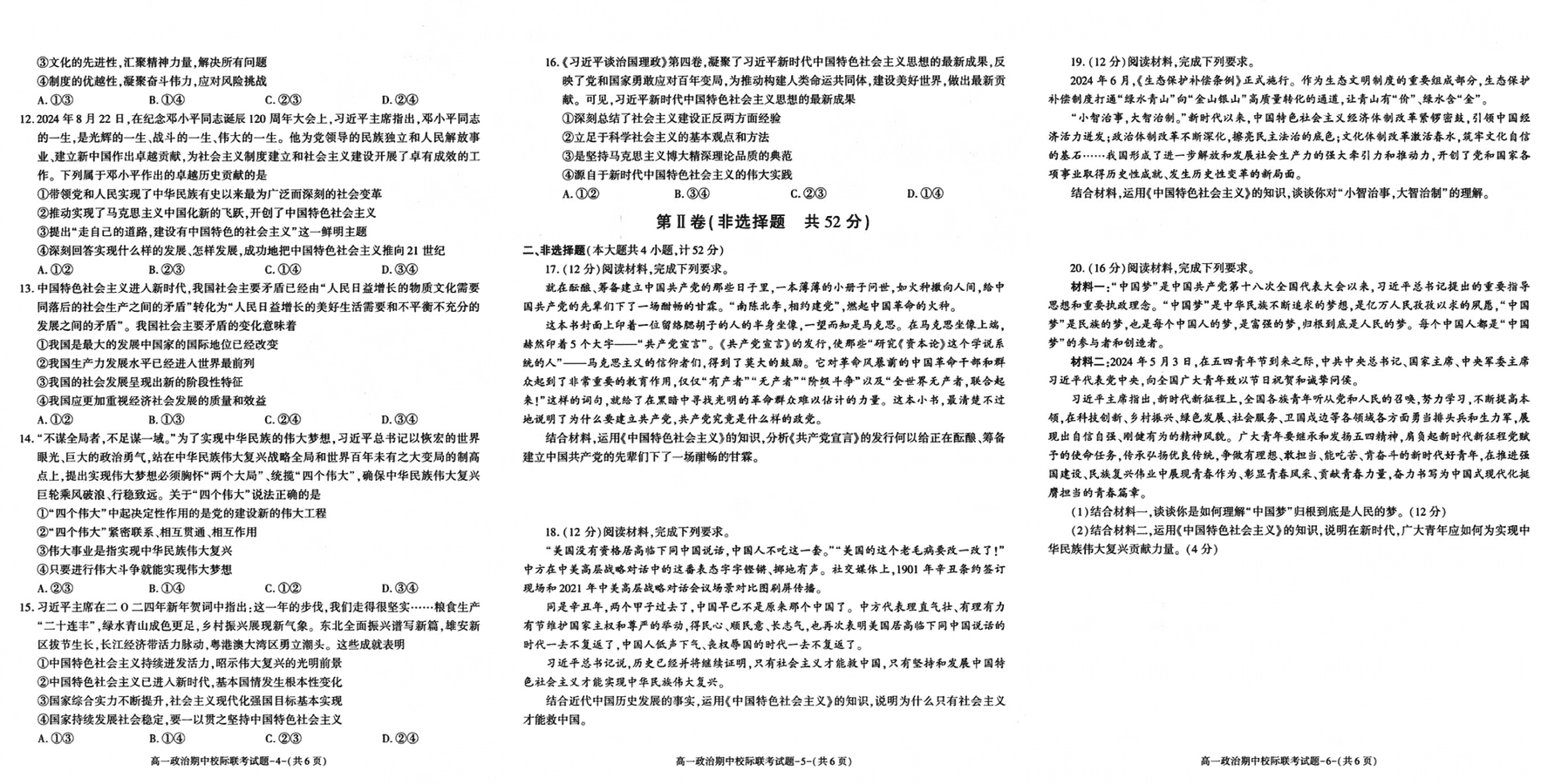 汉中期中联考2024-2025学年高一11月期中政治试题及答案