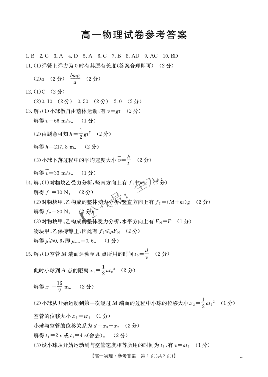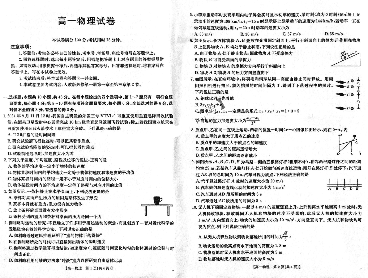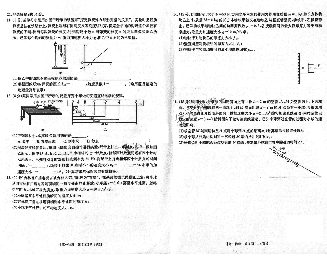 吉黑两省十校联合体2024-2025学年高一上11月期中物理试题及答案