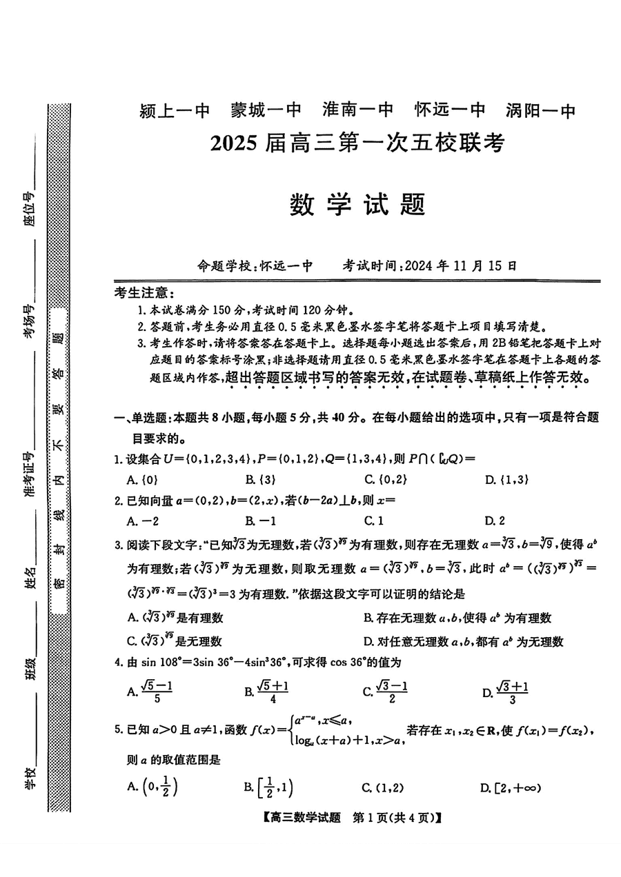 安徽2025届高三第一次五校联考数学试题及答案 时间:2024-11-17 22:57 安徽 数学试题 安徽2025届高三第一次五校联考数学考试已于近日开考,为方便考生考后及时查看考试情况,查漏补缺、弥补不足,本文整理了试题答案解析相关信息! 汇总:安徽2025届高三第一次五校联考试题及答案汇总 数学试题及答案解析