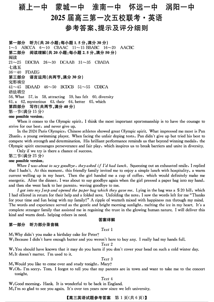 安徽2025届高三第一次五校联考英语试题及答案 时间:2024-11-17 22:59 安徽 英语试题 安徽2025届高三第一次五校联考英语考试已于近日开考,为方便考生考后及时查看考试情况,查漏补缺、弥补不足,本文整理了试题答案解析相关信息! 汇总:安徽2025届高三第一次五校联考试题及答案汇总 英语试题及答案解析