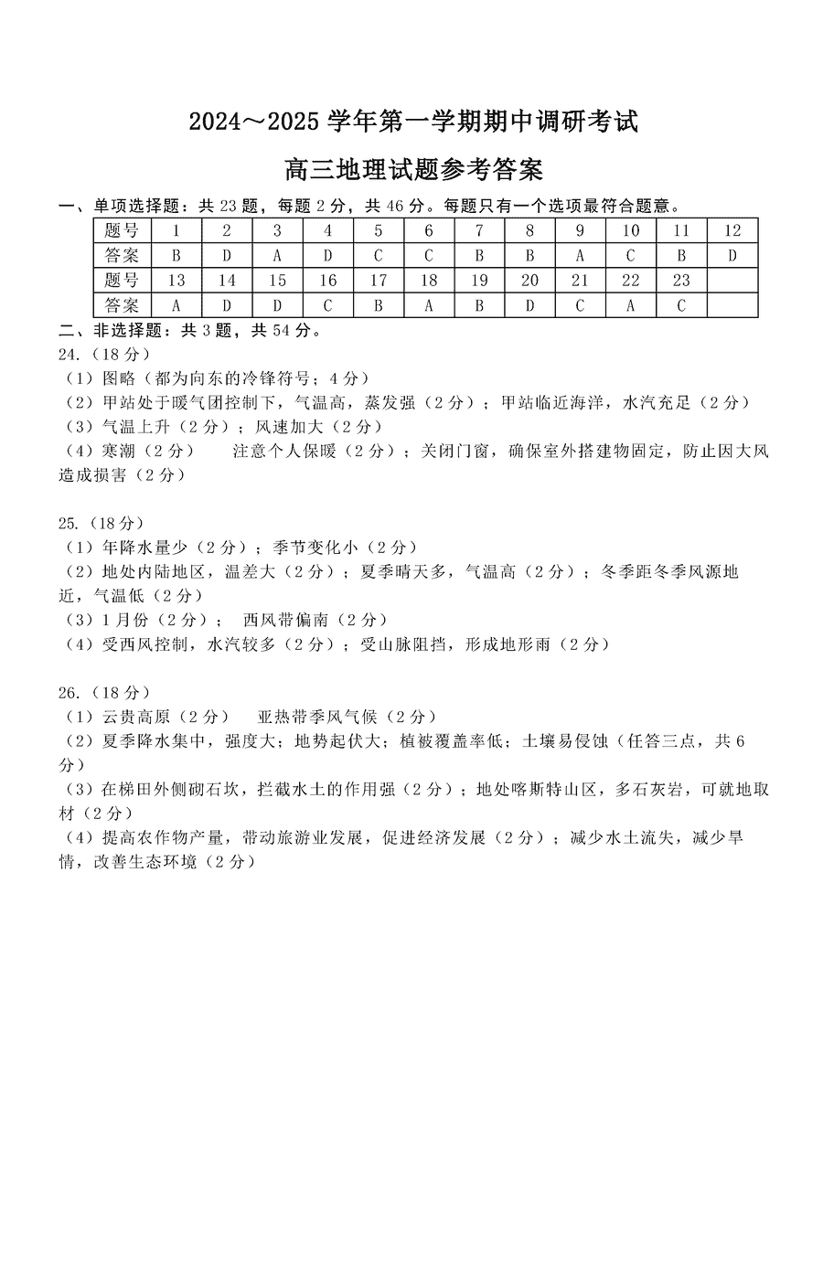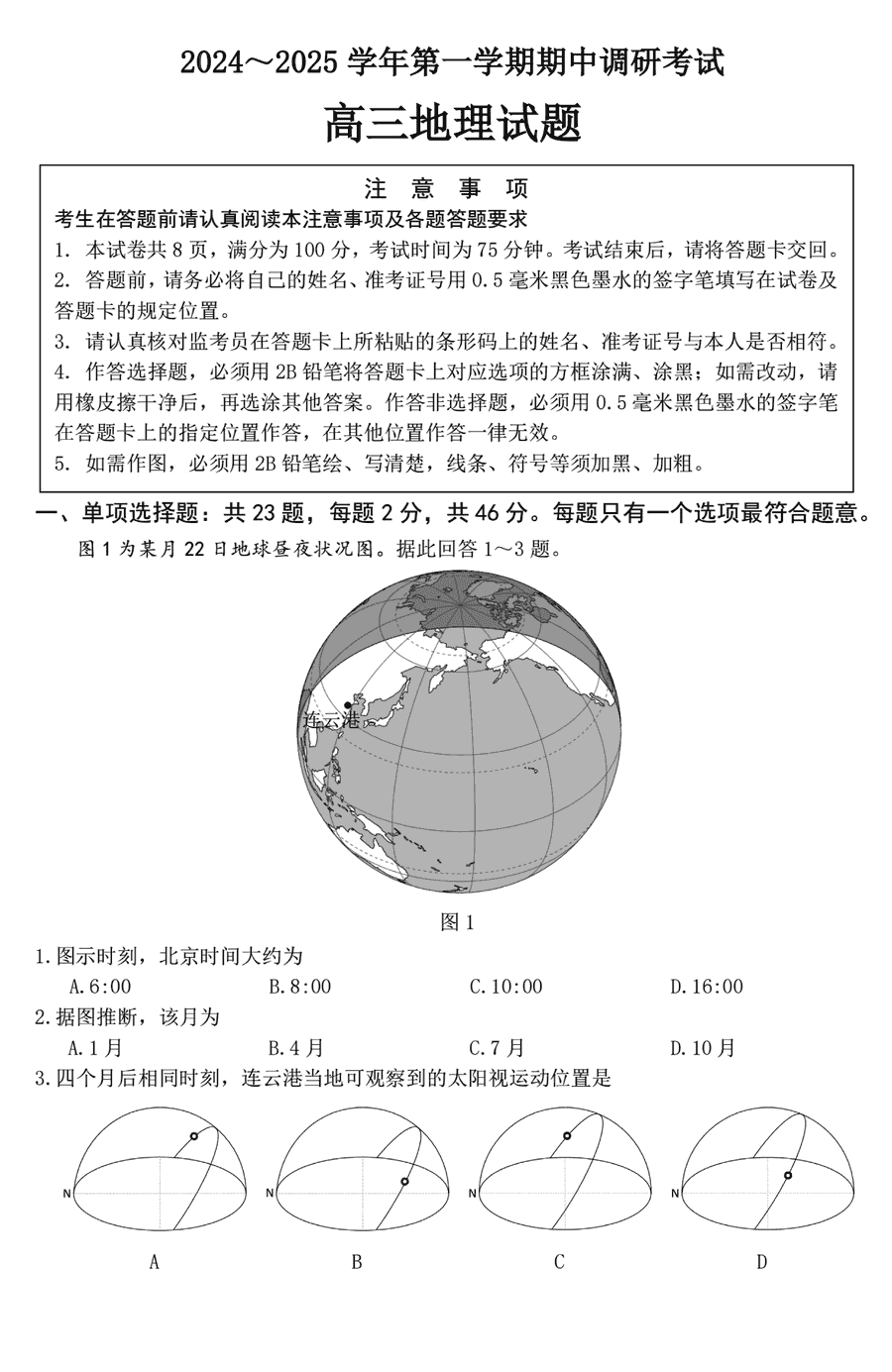 连云港市2024-2025学年高三上学期期中地理试题及答案