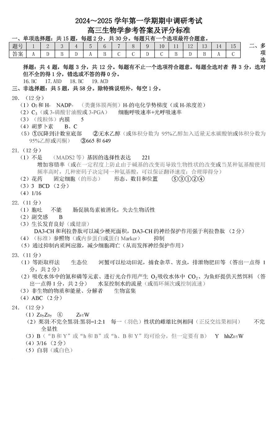 连云港市2024-2025学年高三上学期期中生物试题及答案