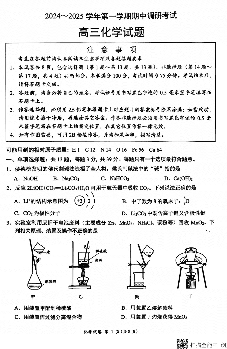 江苏连云港市2024-2025学年高三上学期期中化学考试已于近日开考,为方便考生考后及时查看考试情况,查漏补缺、弥补不足,本文整理了试题答案解析相关信息!