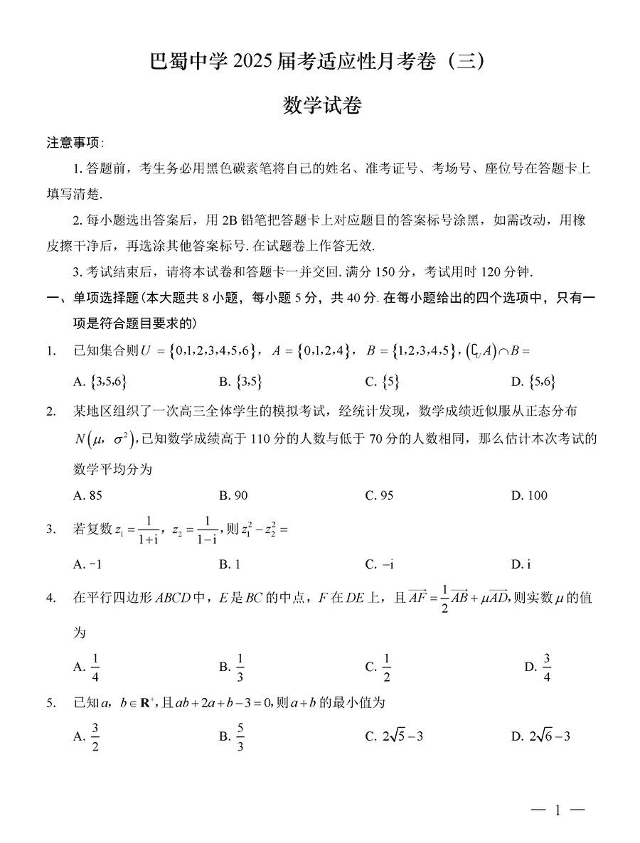 重庆巴蜀中学2025届高考适应性月考卷(三)数学考试已于近日开考,为方便考生考后及时查看考试情况,查漏补缺、弥补不足,本文整理了试题答案解析相关信息!