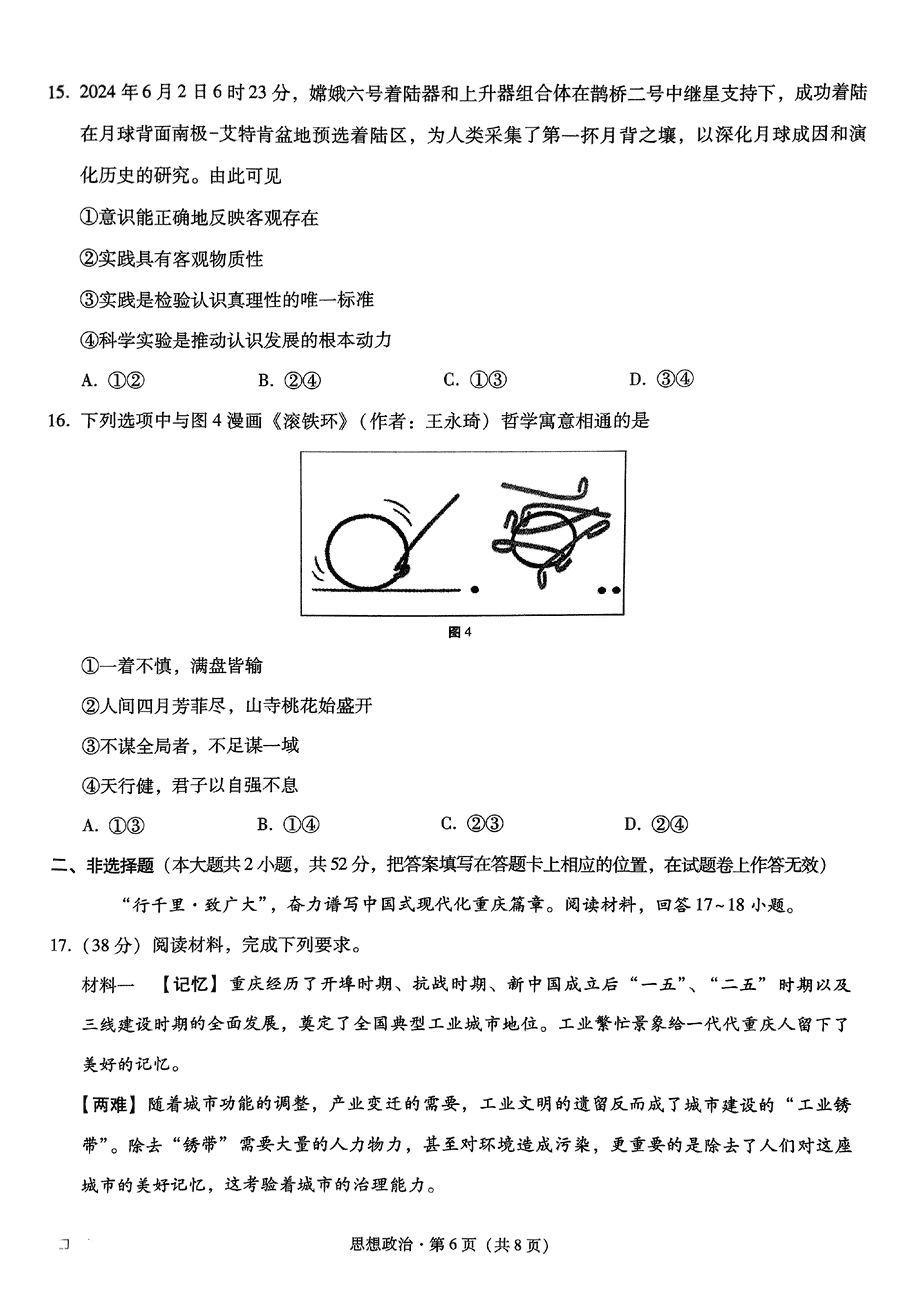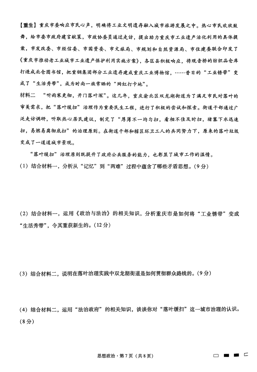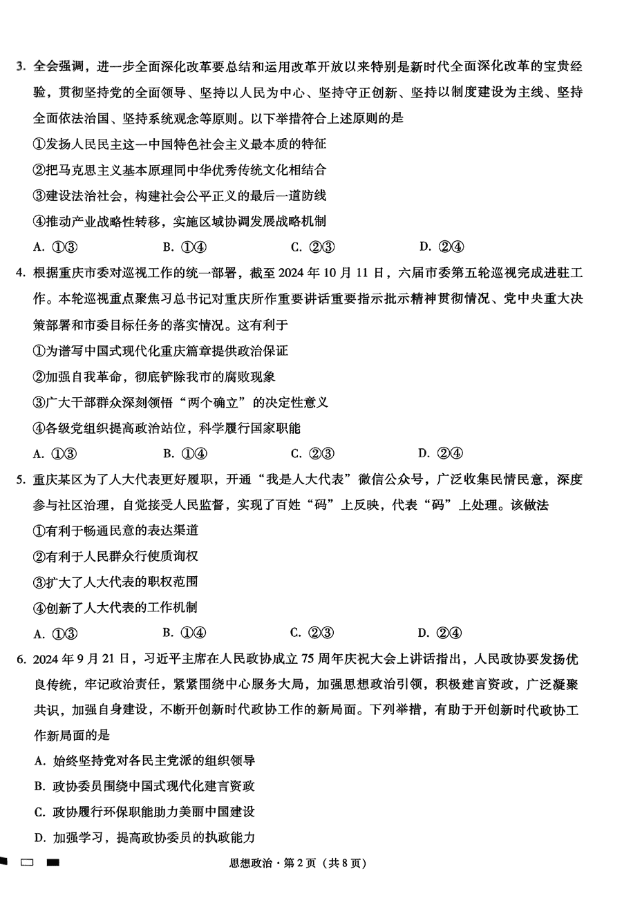 重庆巴蜀中学2025届高考适应性月考卷(三)政治试题及答案