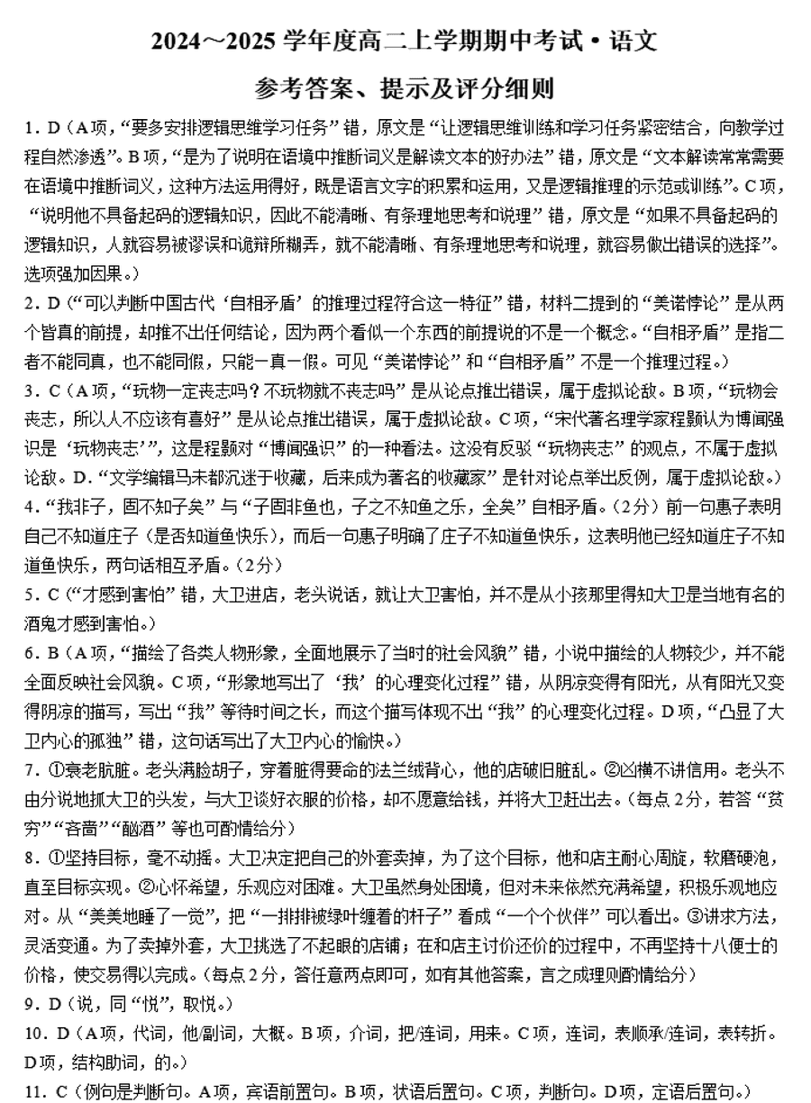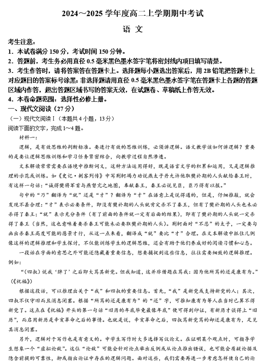 深圳市盟校联盟2024-2025学年高二上11月期中语文试题及答案
