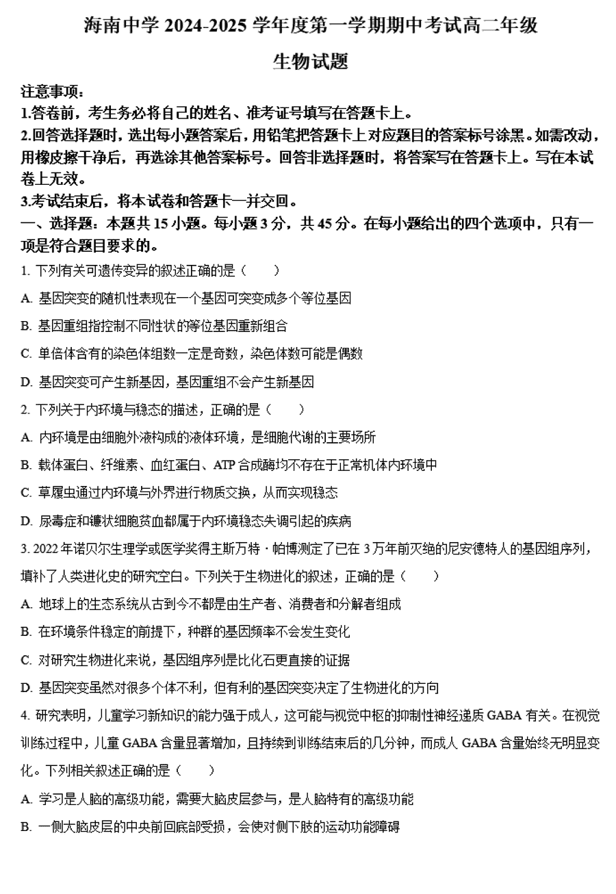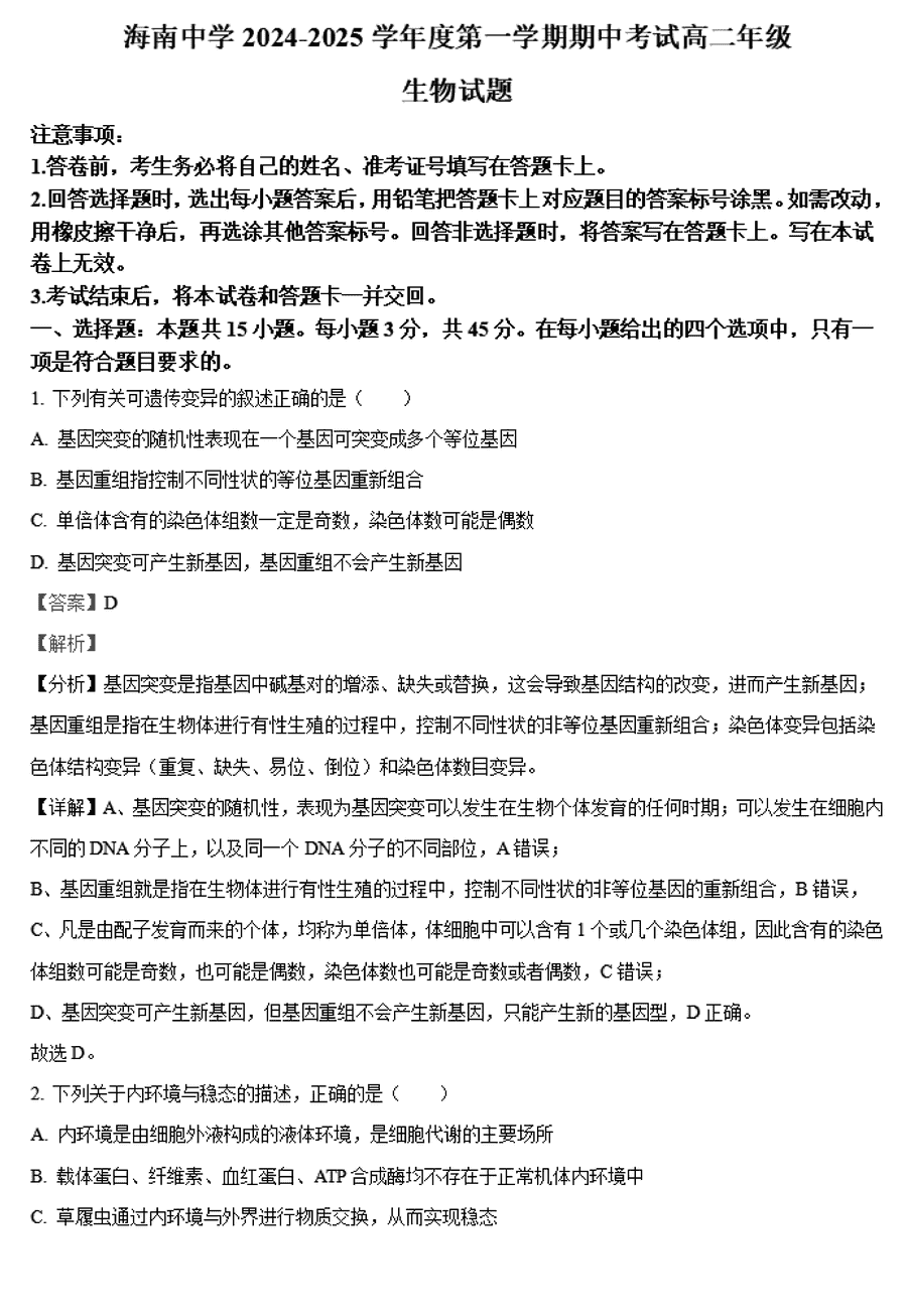 海南中学2024-2025学年高二上学期11月期中生物考试已于近日开考,为方便考生考后及时查看考试情况,查漏补缺、弥补不足,本文整理了试题答案解析相关信息!