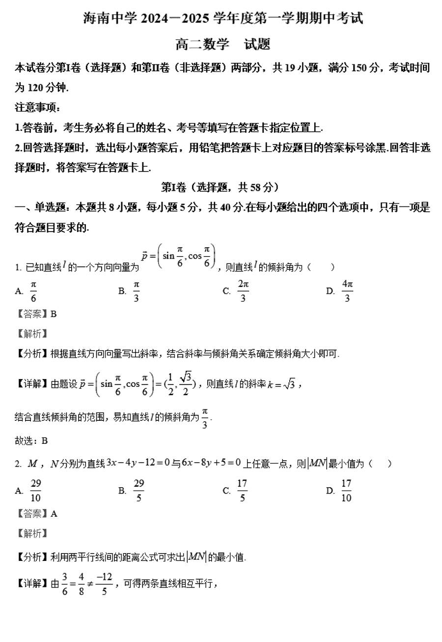 海南中学2024-2025学年高二上学期11月期中数学考试已于近日开考,为方便考生考后及时查看考试情况,查漏补缺、弥补不足,本文整理了试题答案解析相关信息!