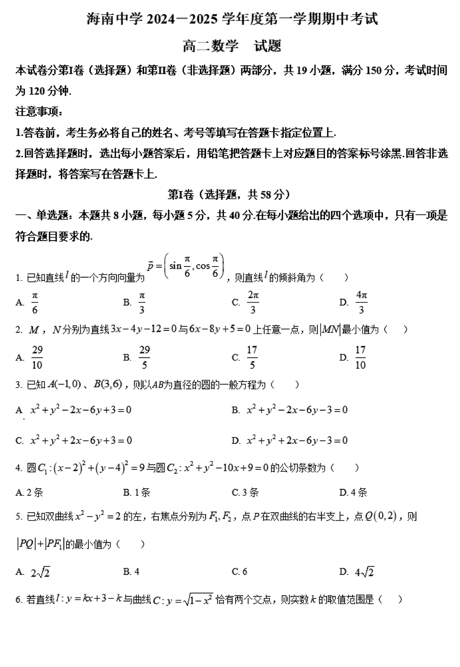 海南中学2024-2025学年高二上学期11月期中数学试题及答案