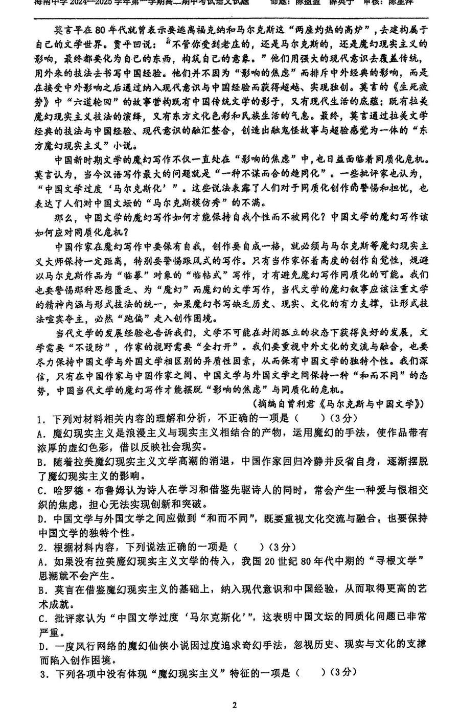 海南中学2024-2025学年高二上学期11月期中语文试题及答案