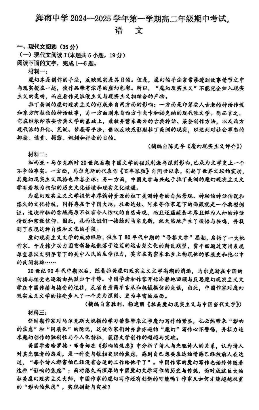 海南中学2024-2025学年高二上学期11月期中语文考试已于近日开考,为方便考生考后及时查看考试情况,查漏补缺、弥补不足,本文整理了试题答案解析相关信息!