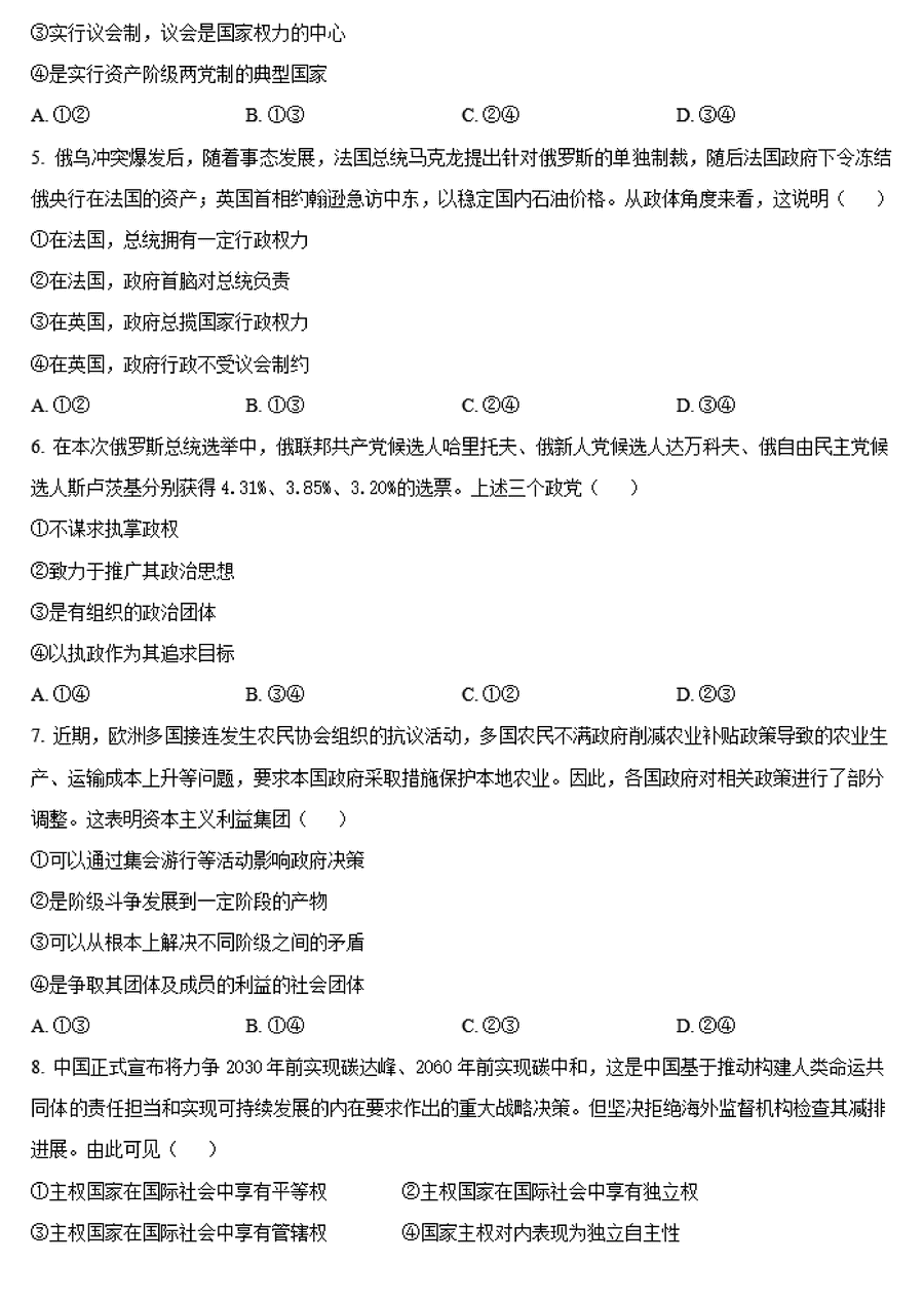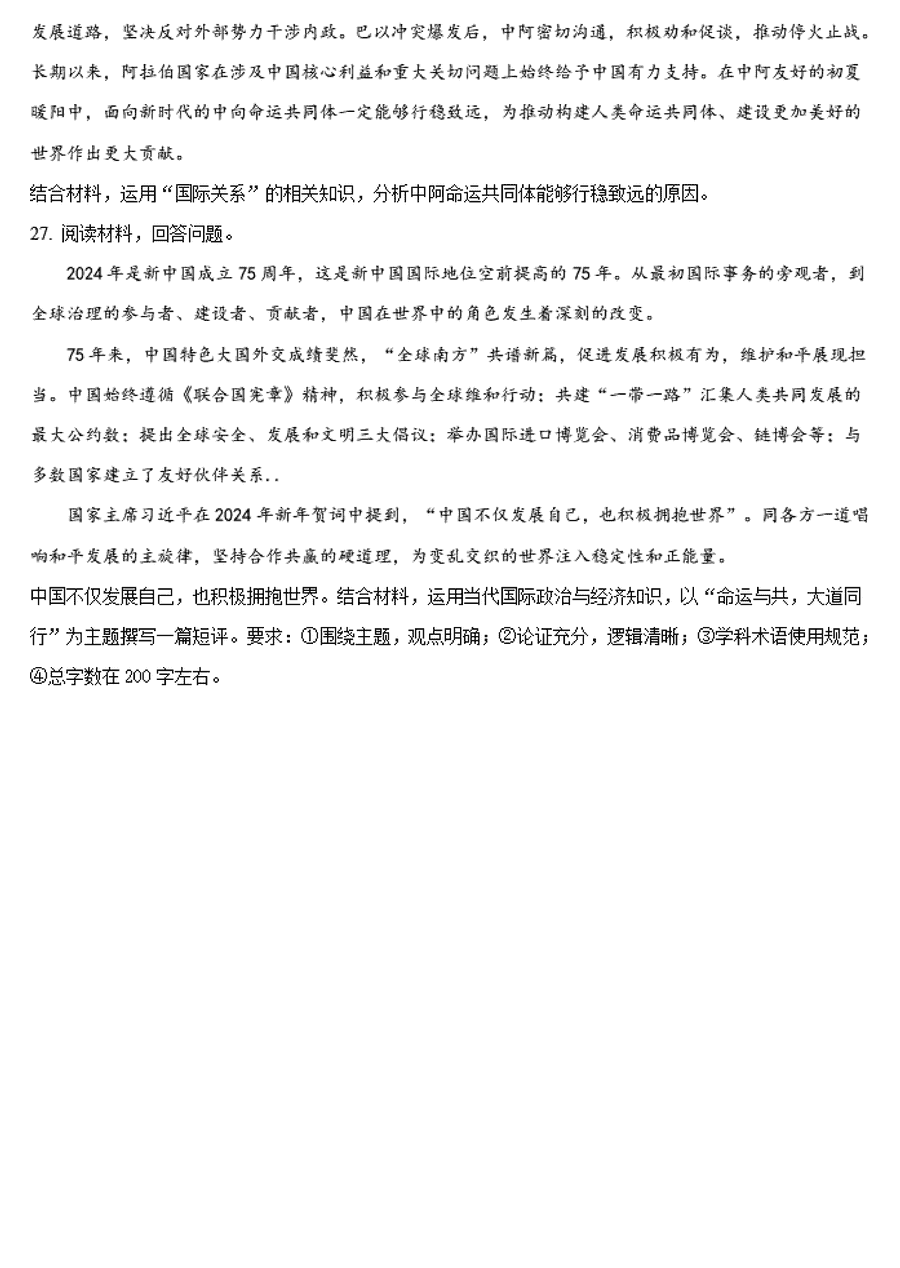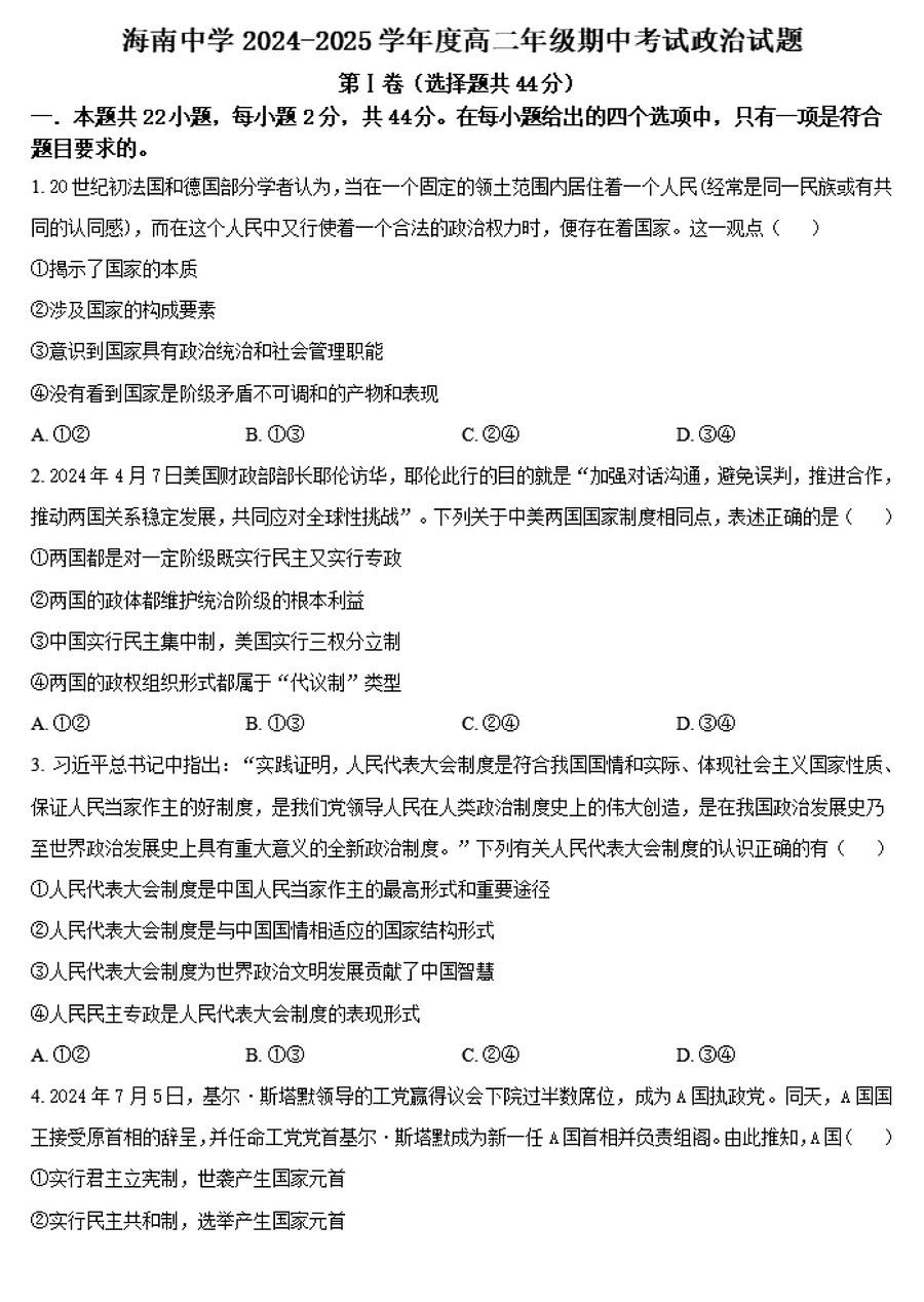 海南中学2024-2025学年高二上学期11月期中政治试题及答案