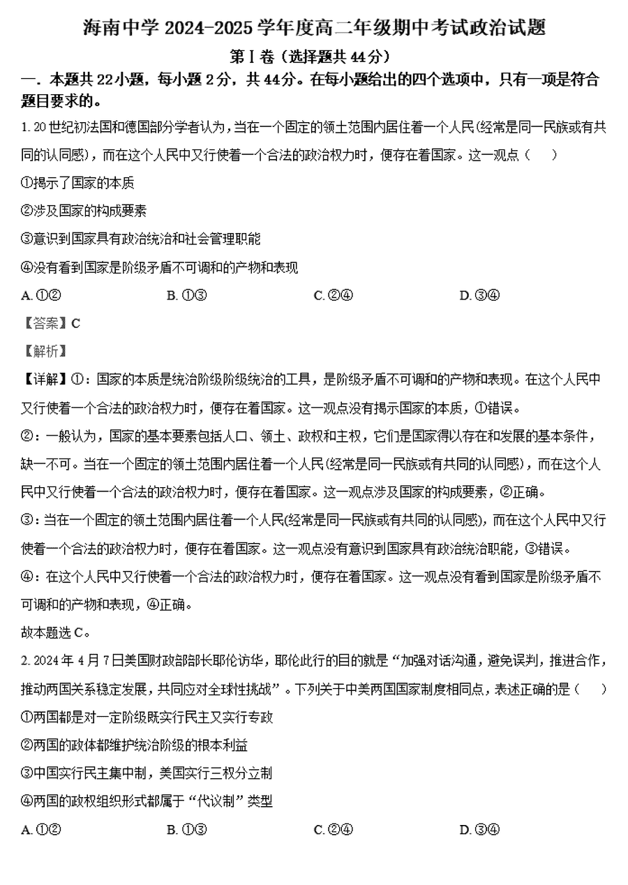 海南中学2024-2025学年高二上学期11月期中政治考试已于近日开考,为方便考生考后及时查看考试情况,查漏补缺、弥补不足,本文整理了试题答案解析相关信息!