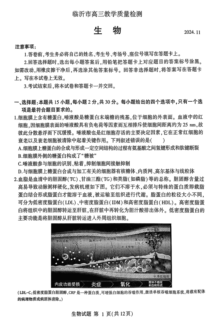 山东临沂2025届高三上学期11月期中质检生物考试已于近日开考,为方便考生考后及时查看考试情况,查漏补缺、弥补不足,本文整理了试题答案解析相关信息!