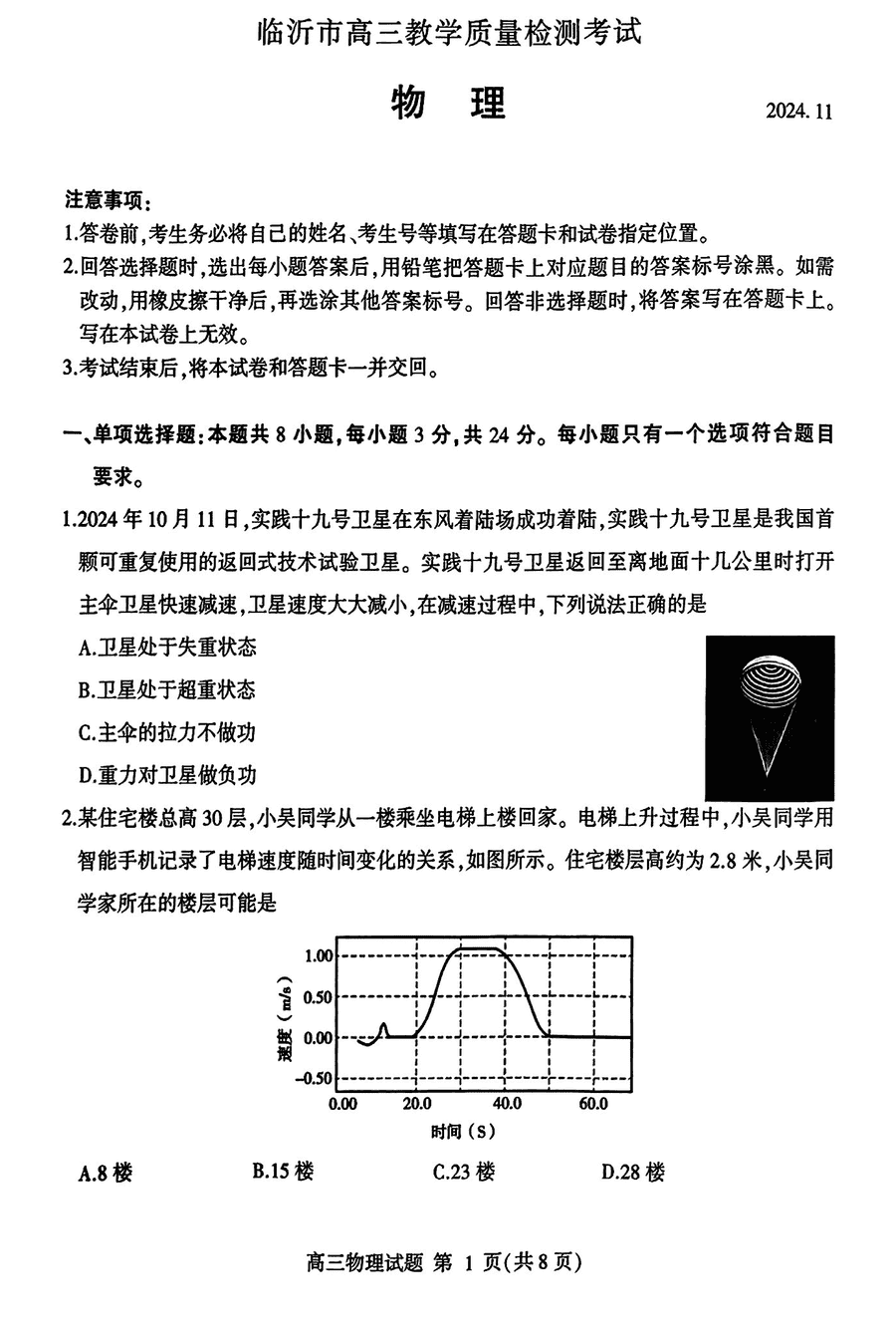 山东临沂2025届高三上学期11月期中质检物理试题及答案