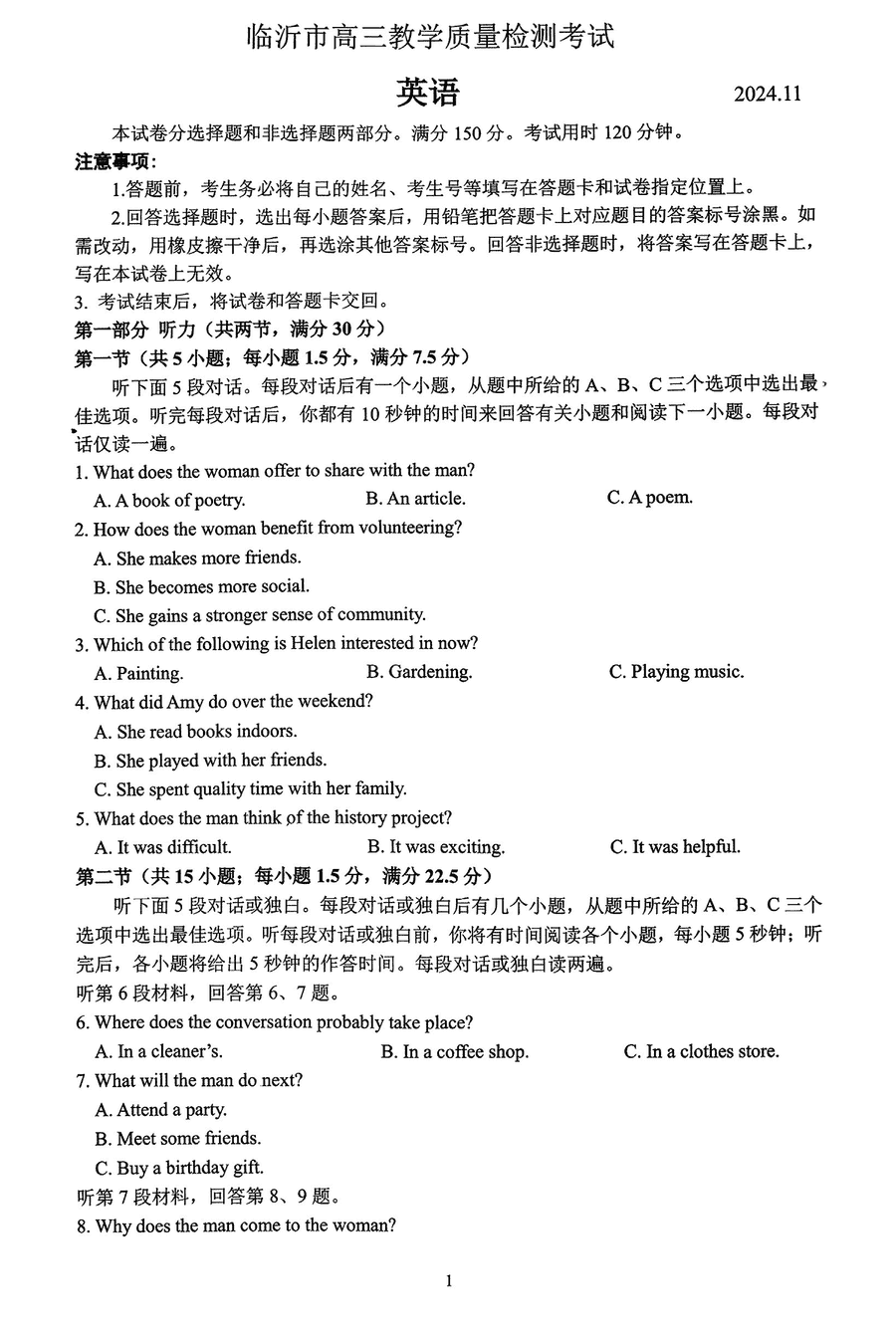山东临沂2025届高三上学期11月期中质检英语考试已于近日开考,为方便考生考后及时查看考试情况,查漏补缺、弥补不足,本文整理了试题答案解析相关信息!