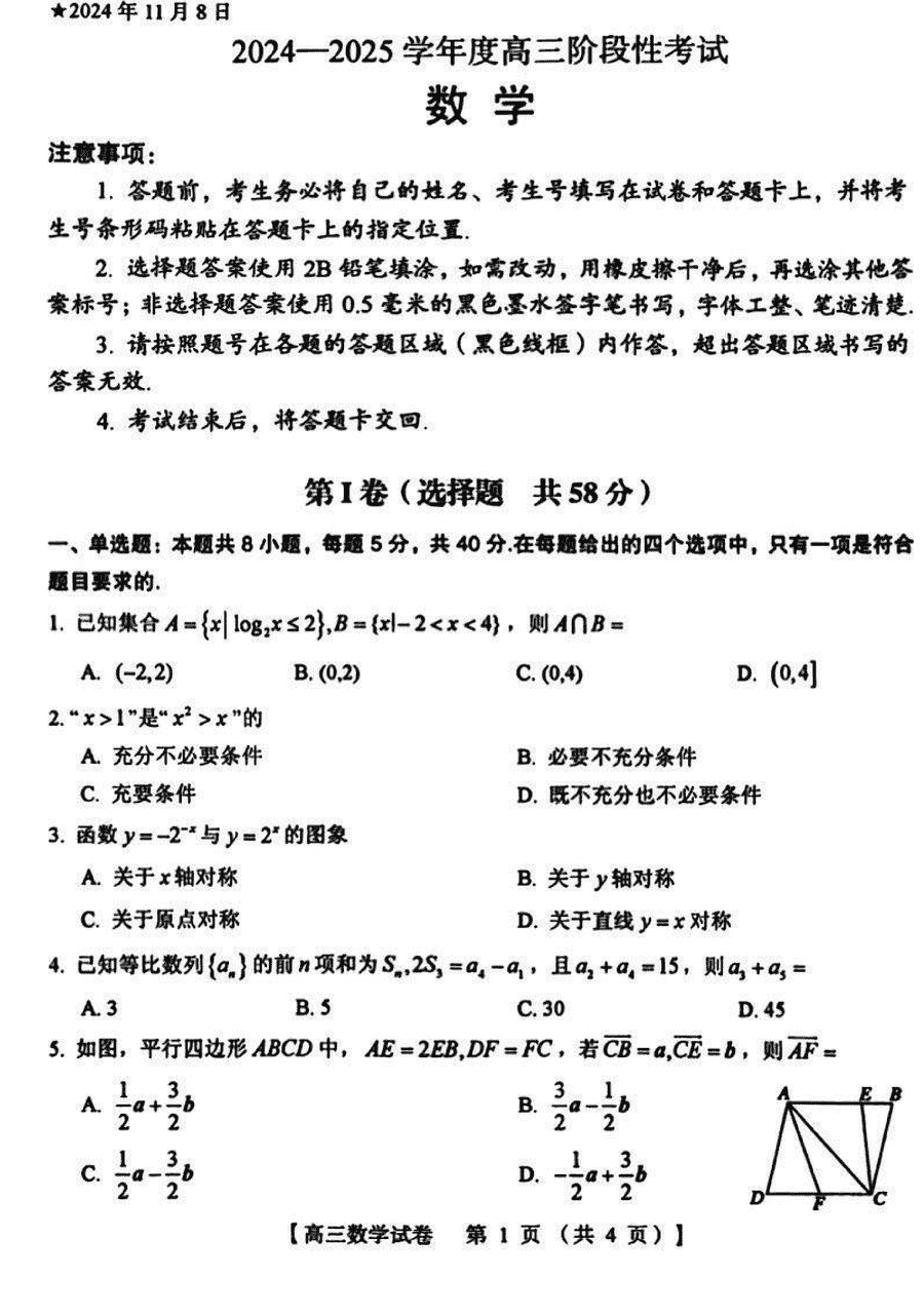 河南三门峡2024-2025学年高三上学期11月期中数学试题及答案