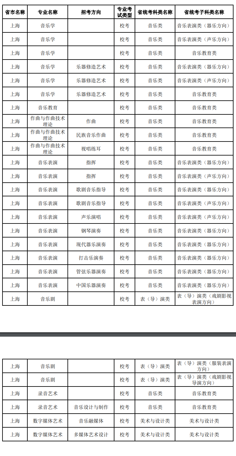 2025年上海音乐学院本科艺术类招生专业与各省统考科类对照关系表-上海