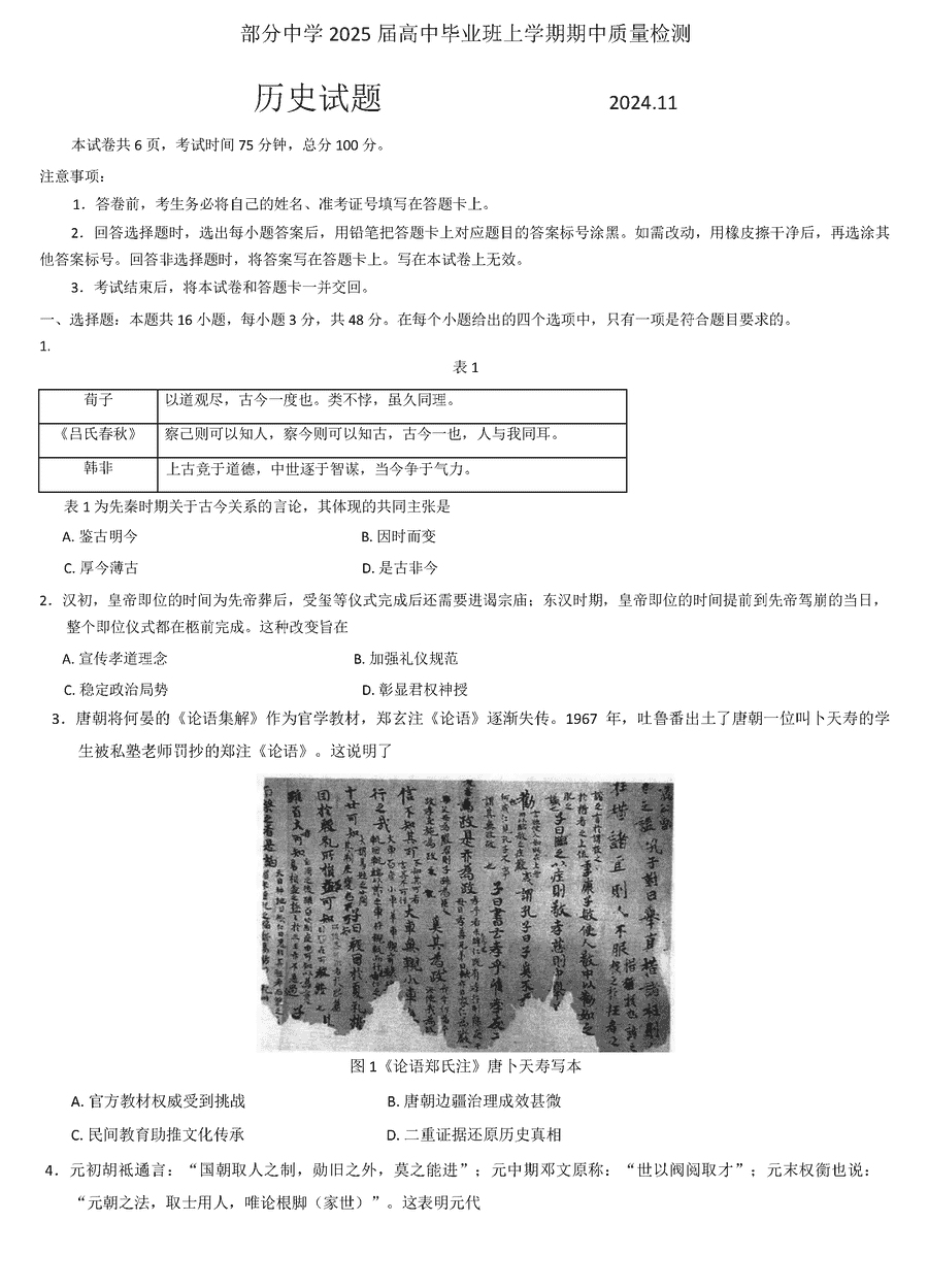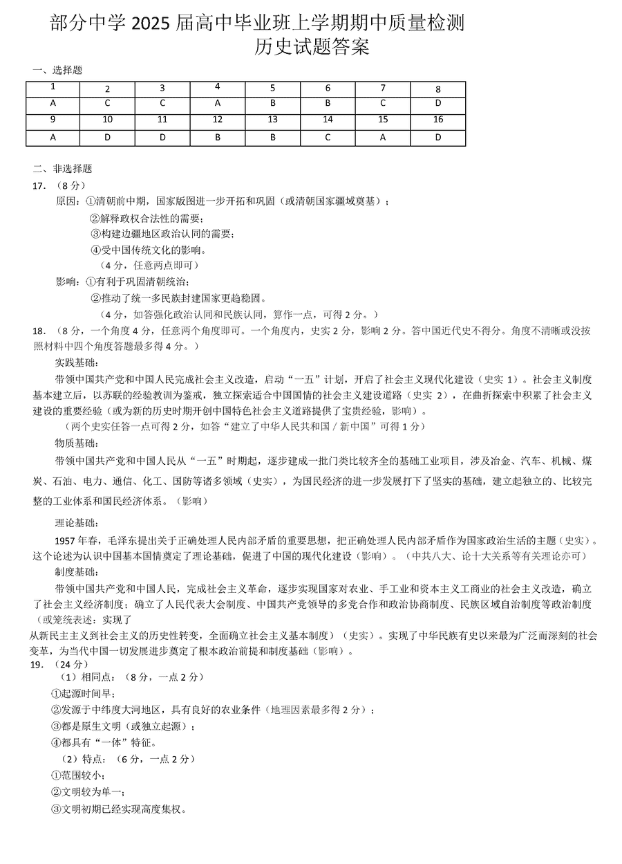 福建名校联考2025届高三11月期中质检历史试题及答案
