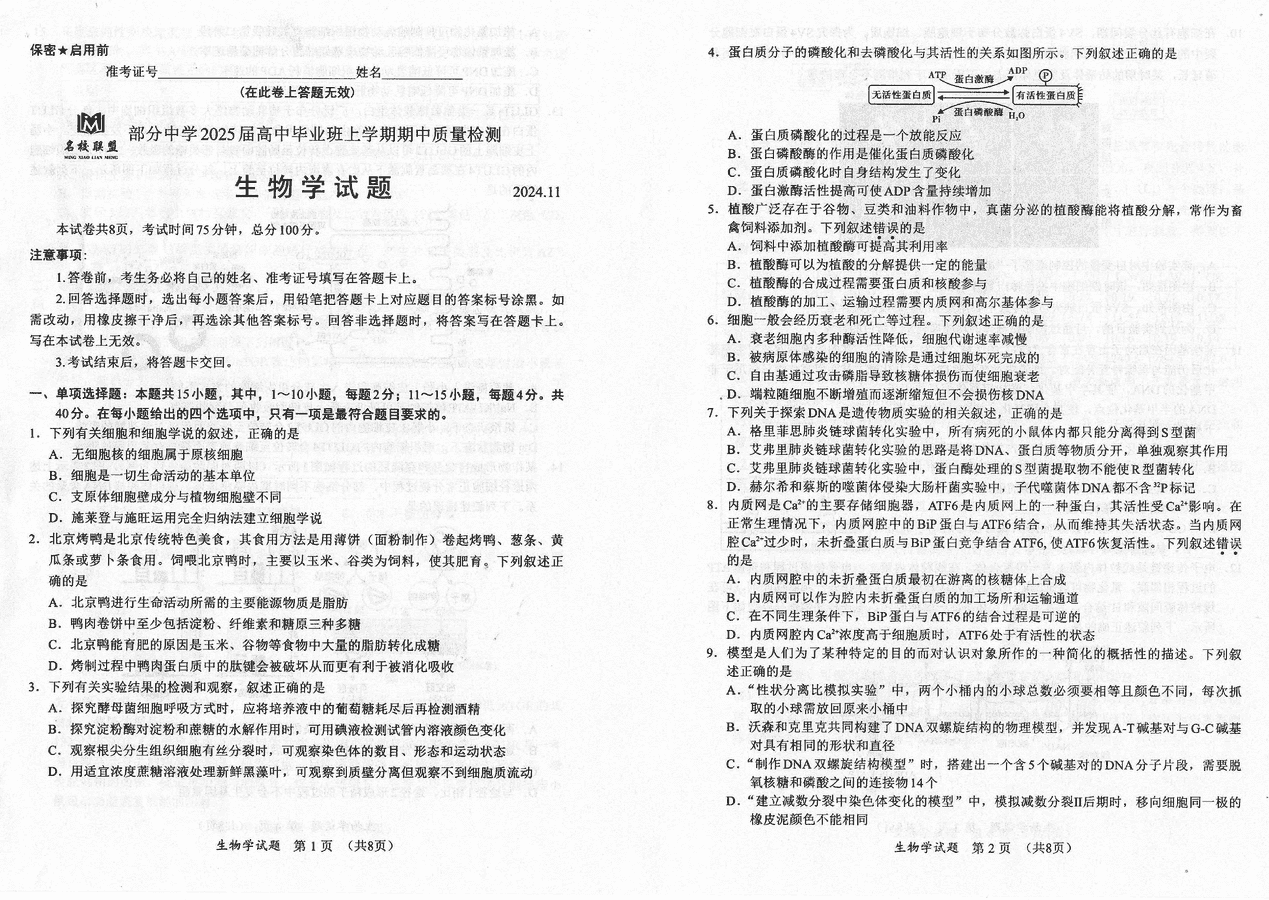 福建名校联考2025届高三11月期中质检生物试题及答案