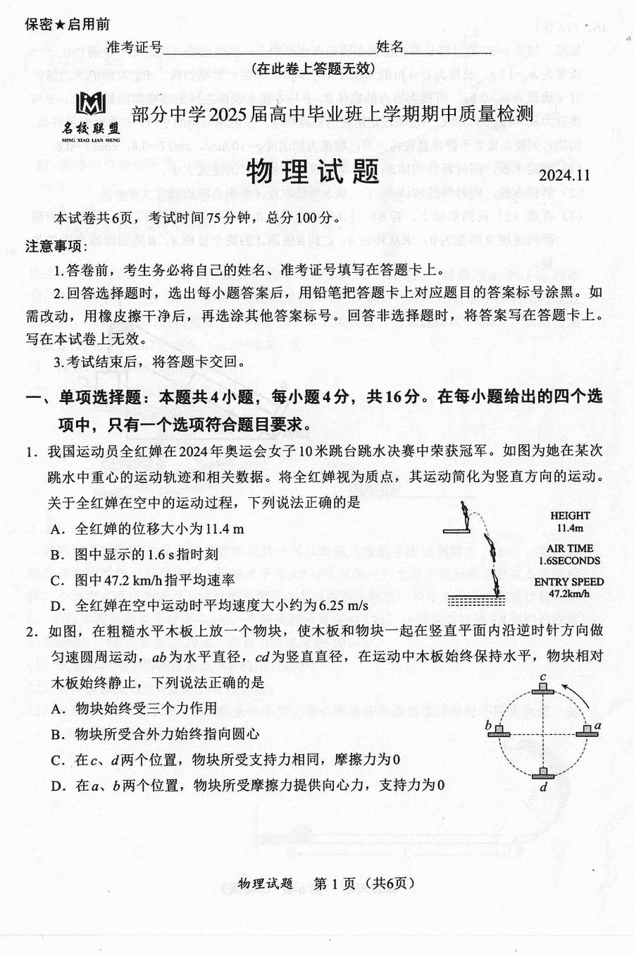 福建名校联考2025届高三11月期中质检物理试题及答案