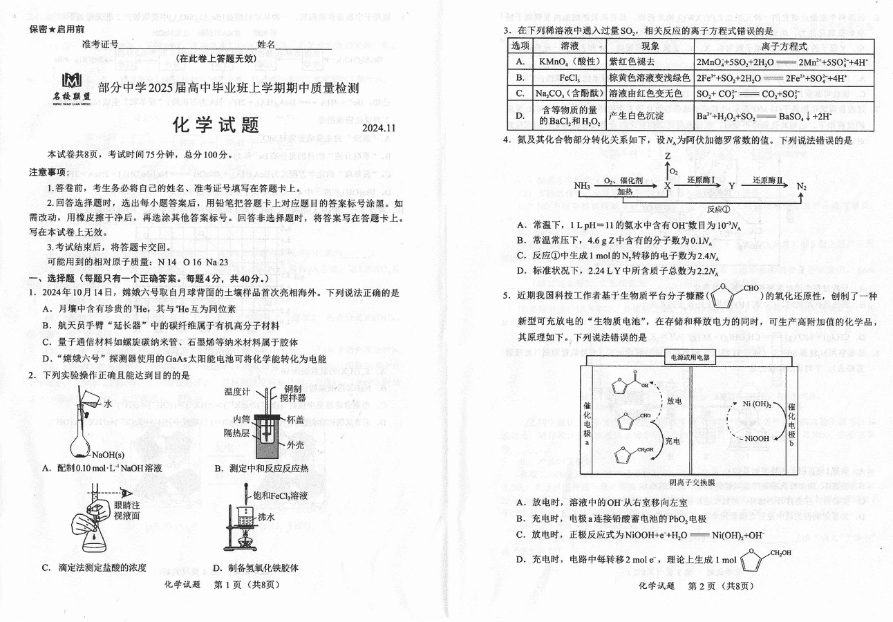 福建名校联考2025届高三11月期中质检化学试题及答案