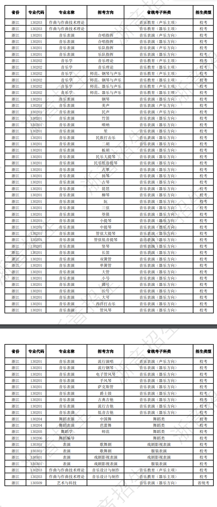 浙江音乐学院2025年本科艺术类招生专业与各省统考子科类对照表