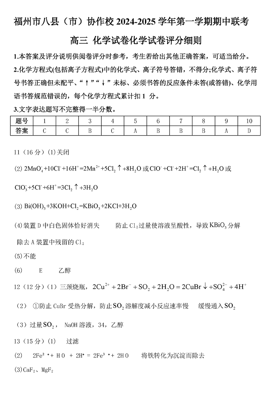 福州八县市协作校2025届高三上学期期中联考化学考试已于近日开考,为方便考生考后及时查看考试情况,查漏补缺、弥补不足,本文整理了试题答案解析相关信息!