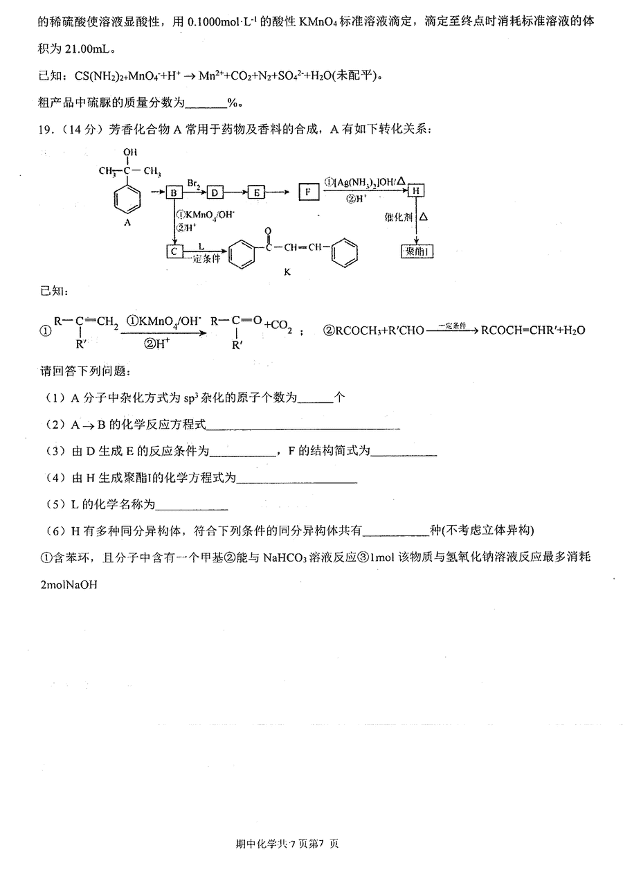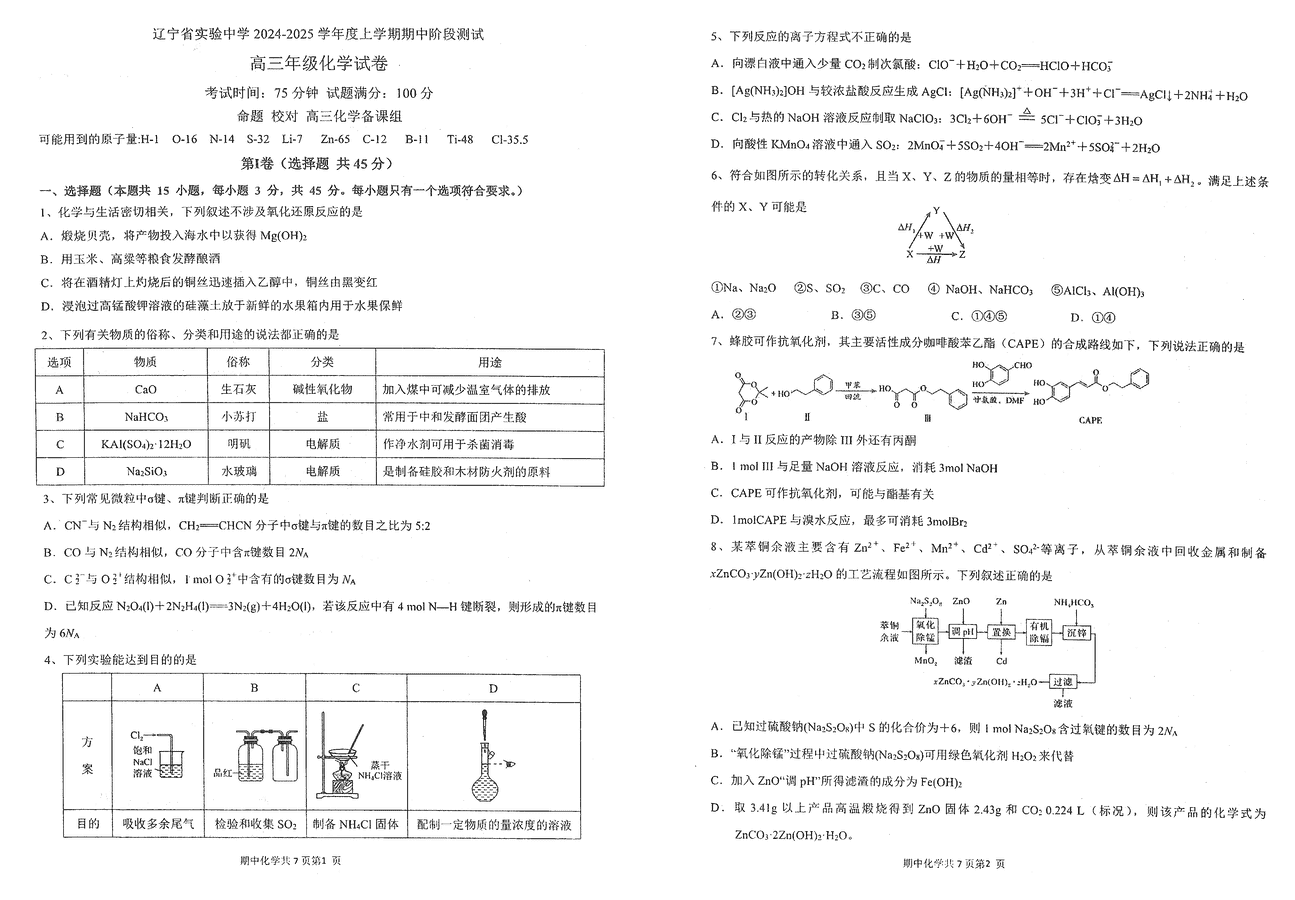 辽宁实验中学2024-2025学年高三上学期期中化学试题及答案