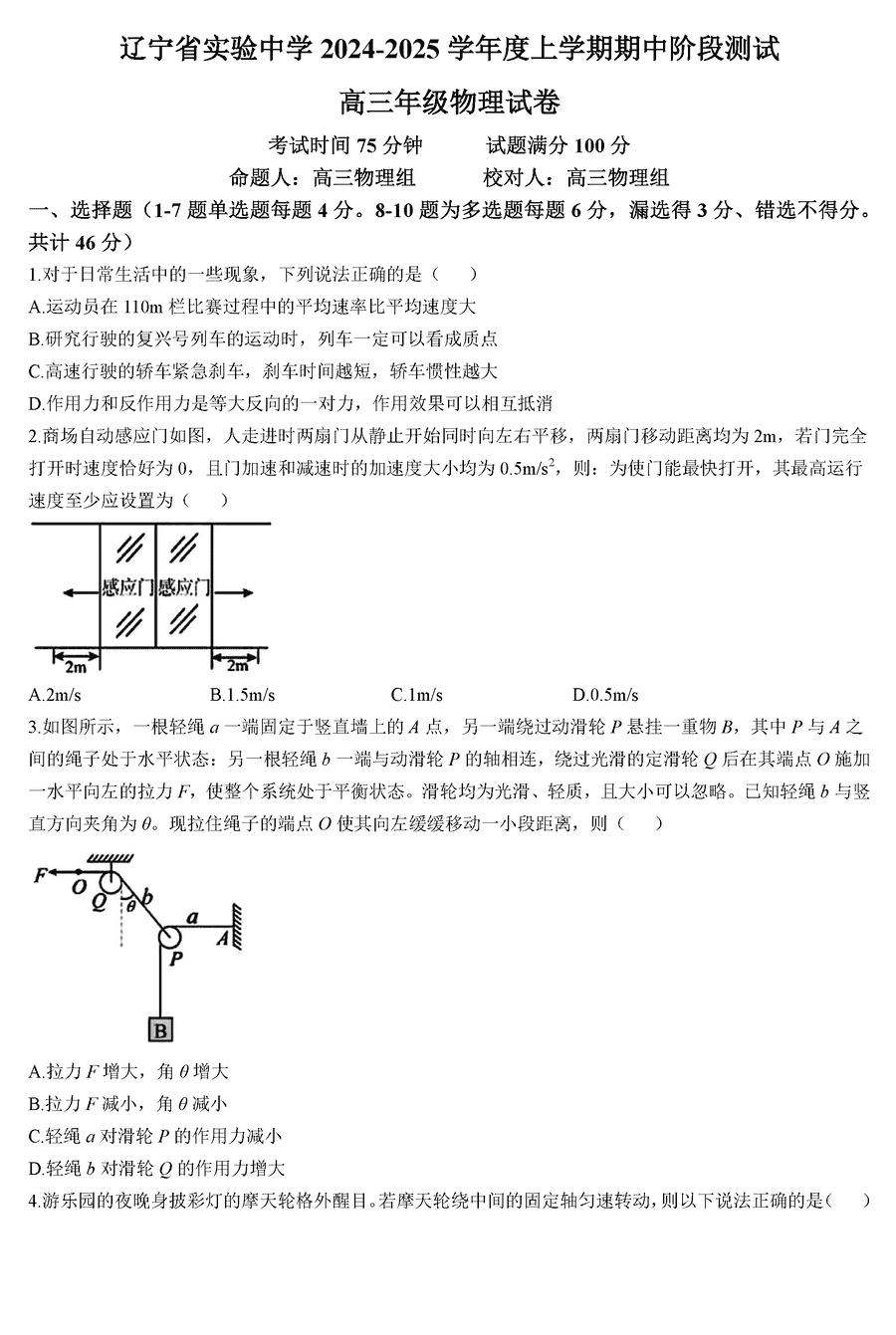 辽宁实验中学2024-2025学年高三上学期期中物理试题及答案