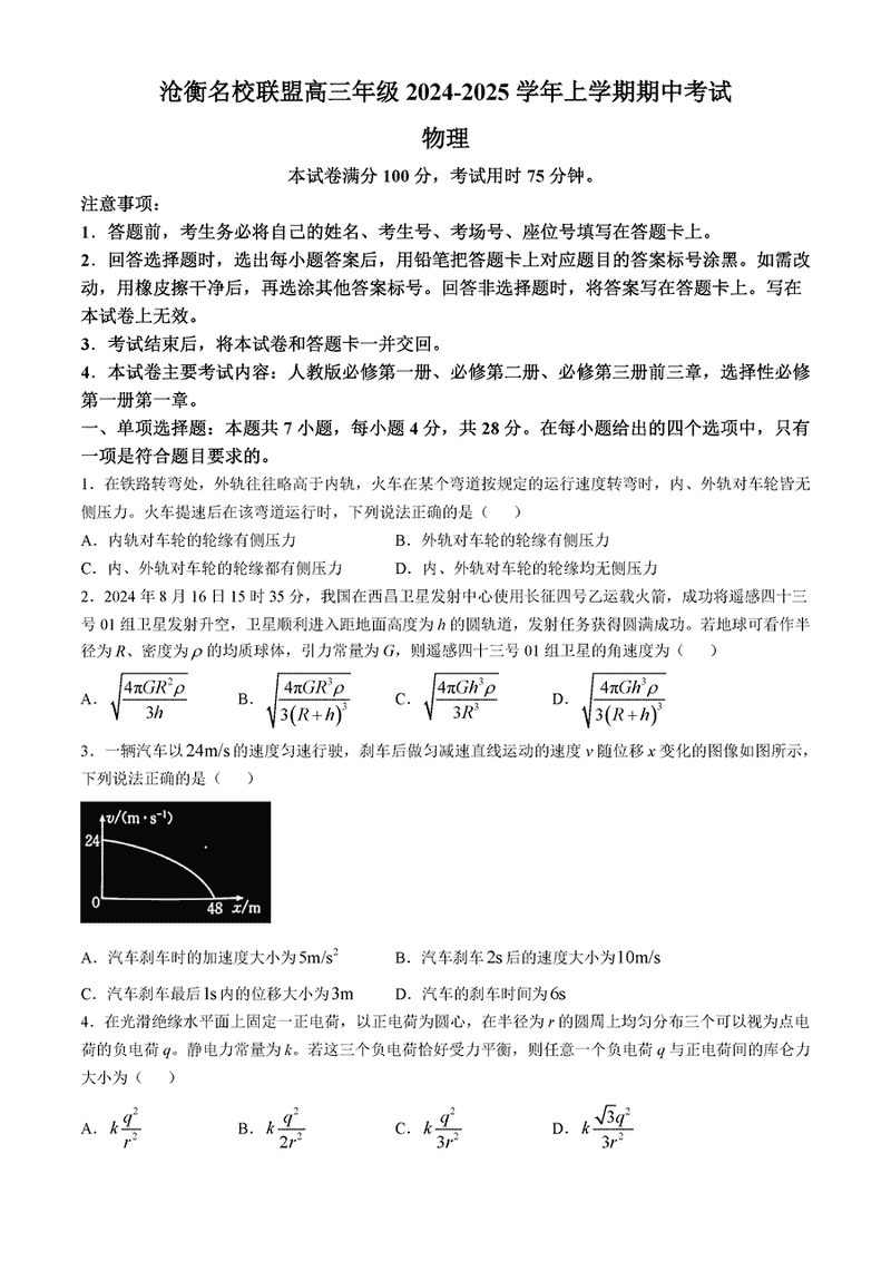 河北沧衡名校联盟2025届高三上学期11月期中物理试题及答案